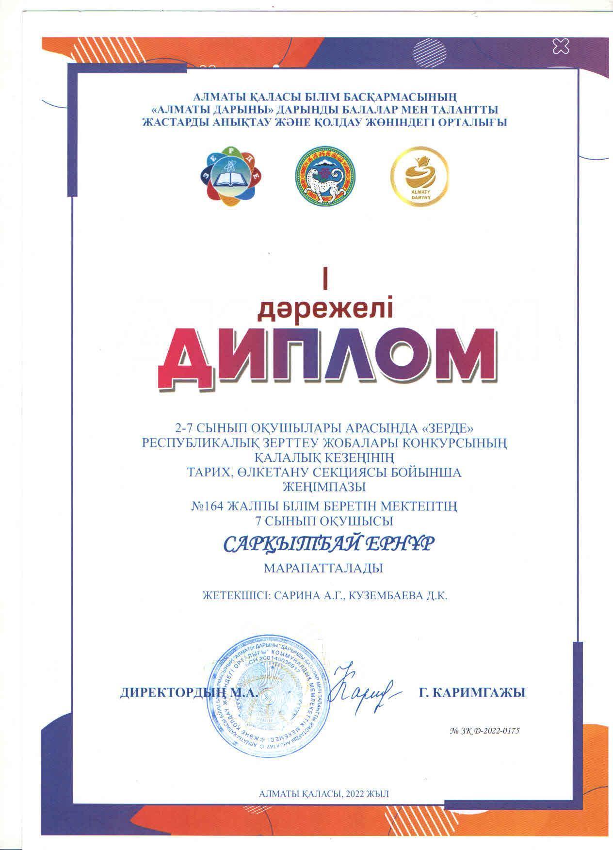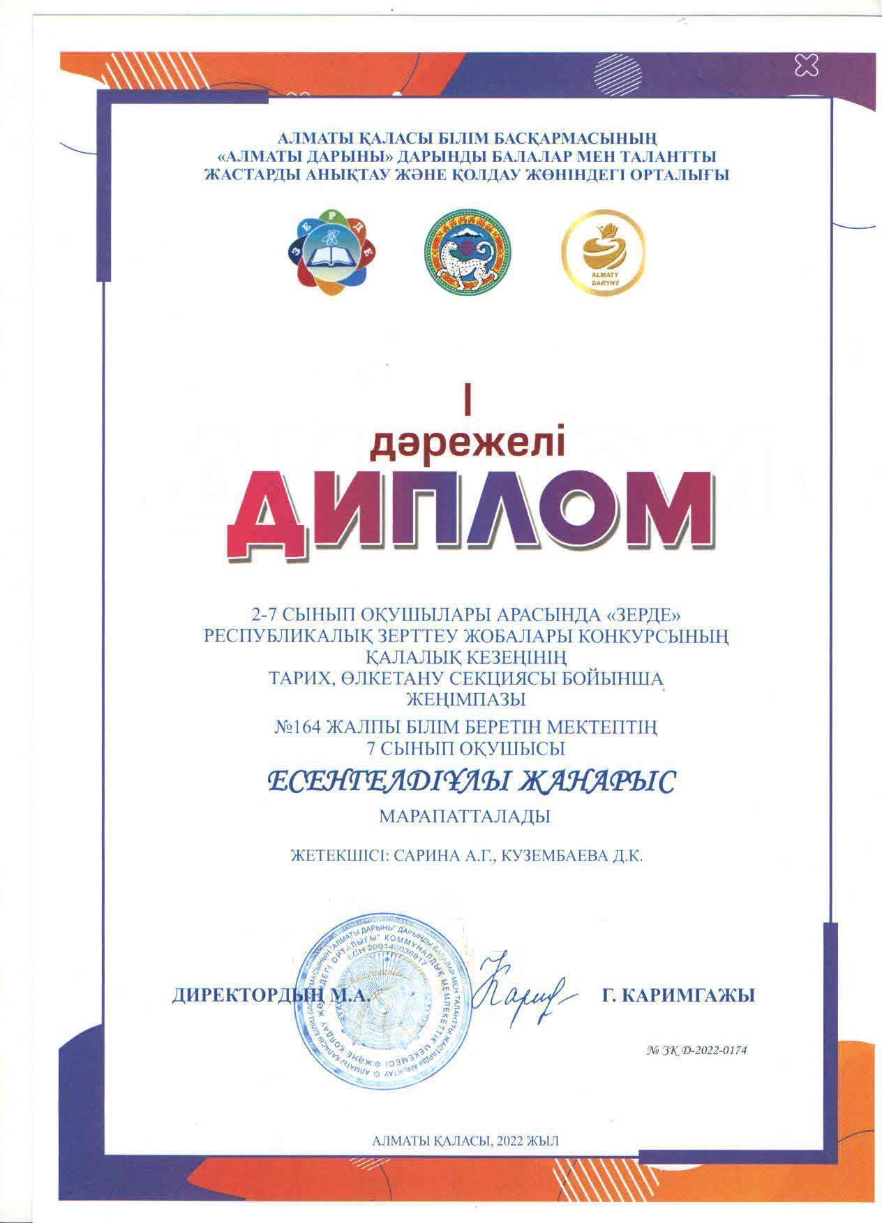№164 Жалпы білім беретін мектеп » Ақпарат » 2-7 сынып оқушыларына арналған зерттеу жұмыстары мен шығармашылық жобаларының "ЗЕРДЕ" республикалық конкурсының ҚАЛАЛЫҚ кезеңінің "Тарих, өлкетану" секциясы бойынша І орын иегерлері 7"А" сынып оқушылары Ж.Есенгелдіұлы мен Е.Сарқытбай.