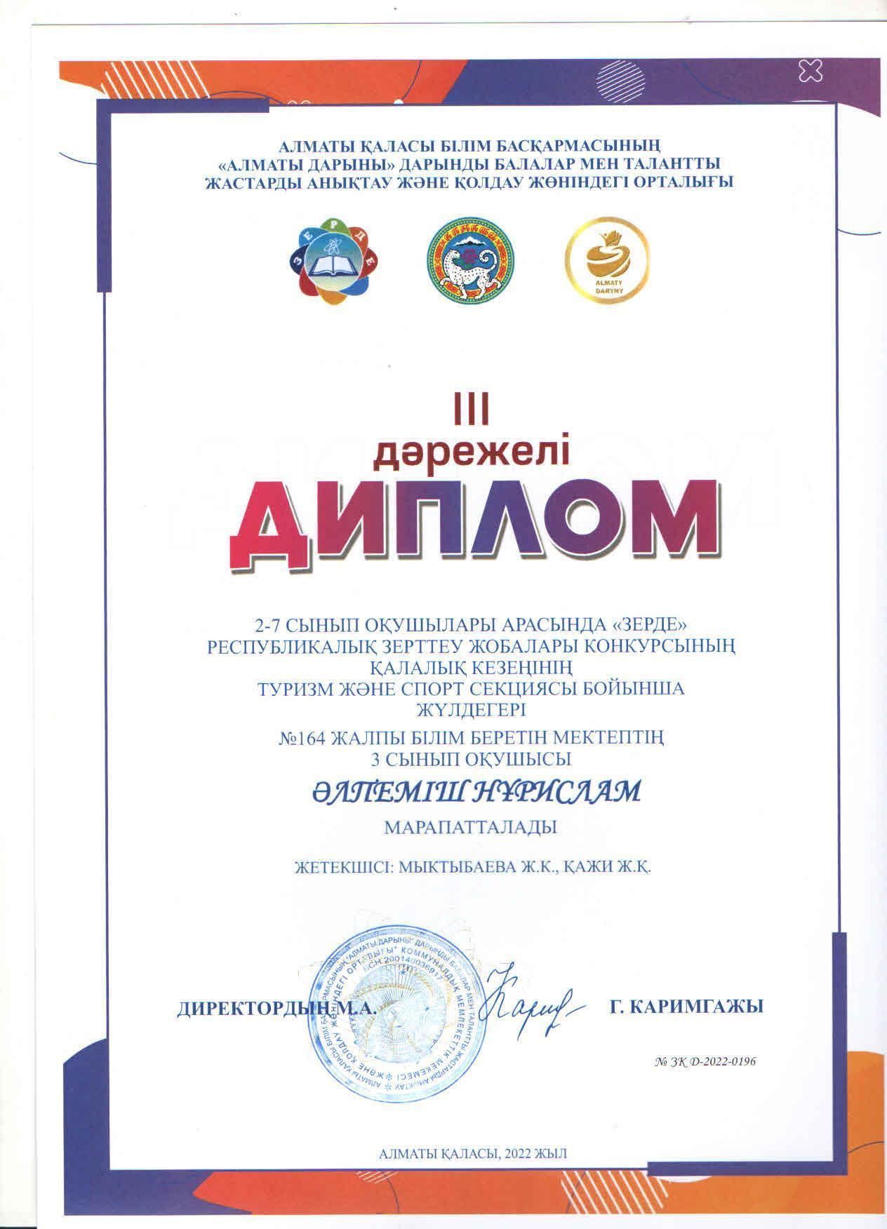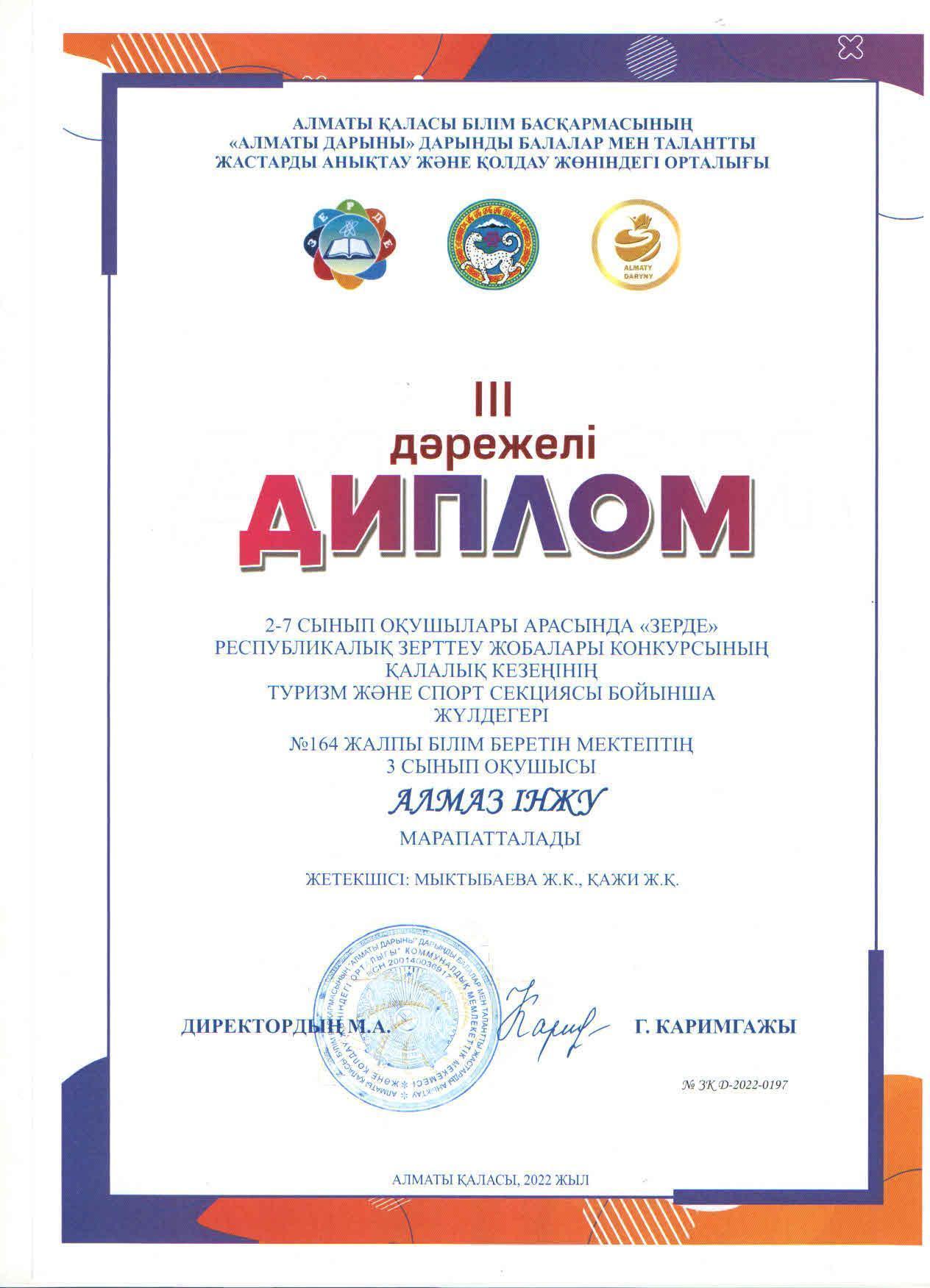 №164 Жалпы білім беретін мектеп » Ақпарат » 2-7сынып оқушыларына арналған зерттеу жұмыстарымен шығармашылық жобаларының "ЗЕРДЕ" республикалық конкурсының ҚАЛАЛЫҚ кезеңінің "Туризм және спорт" секциясы бойынша 3 орын иегерлері 3"Б" сынып Н.Әлпеміш пен 4 "Б" сынып І.Алмаз.