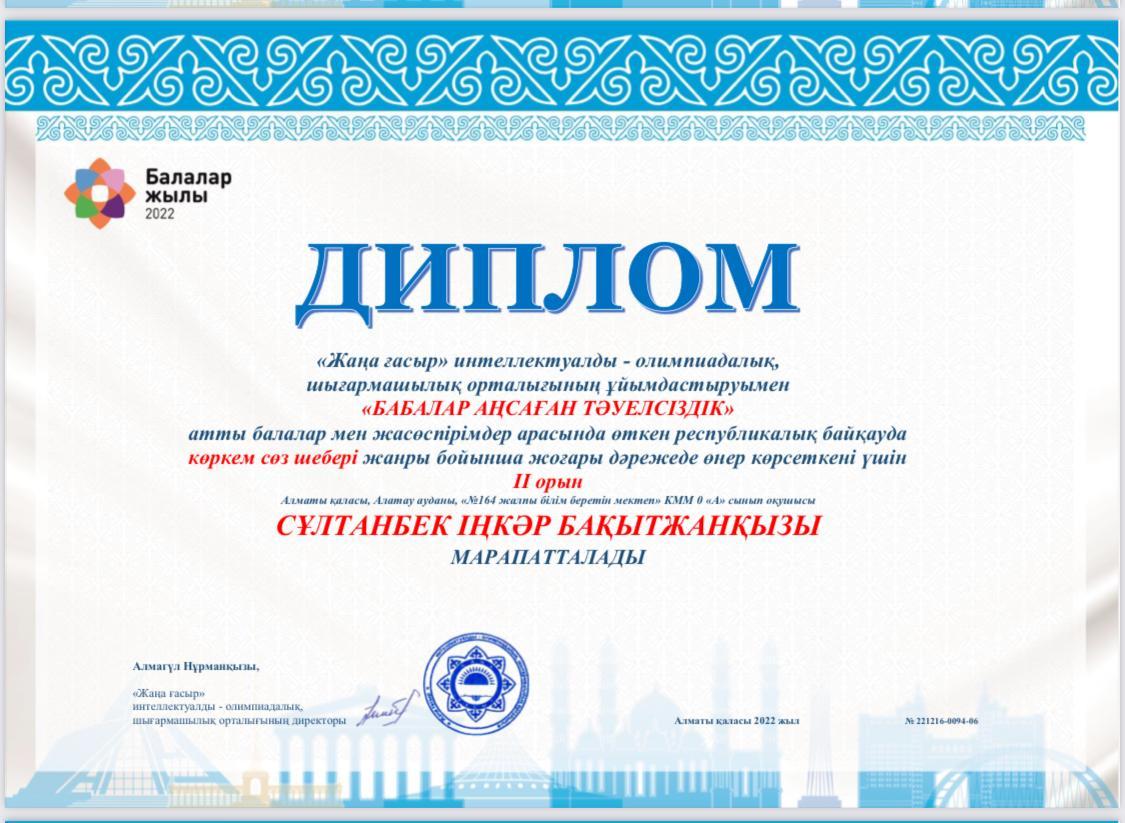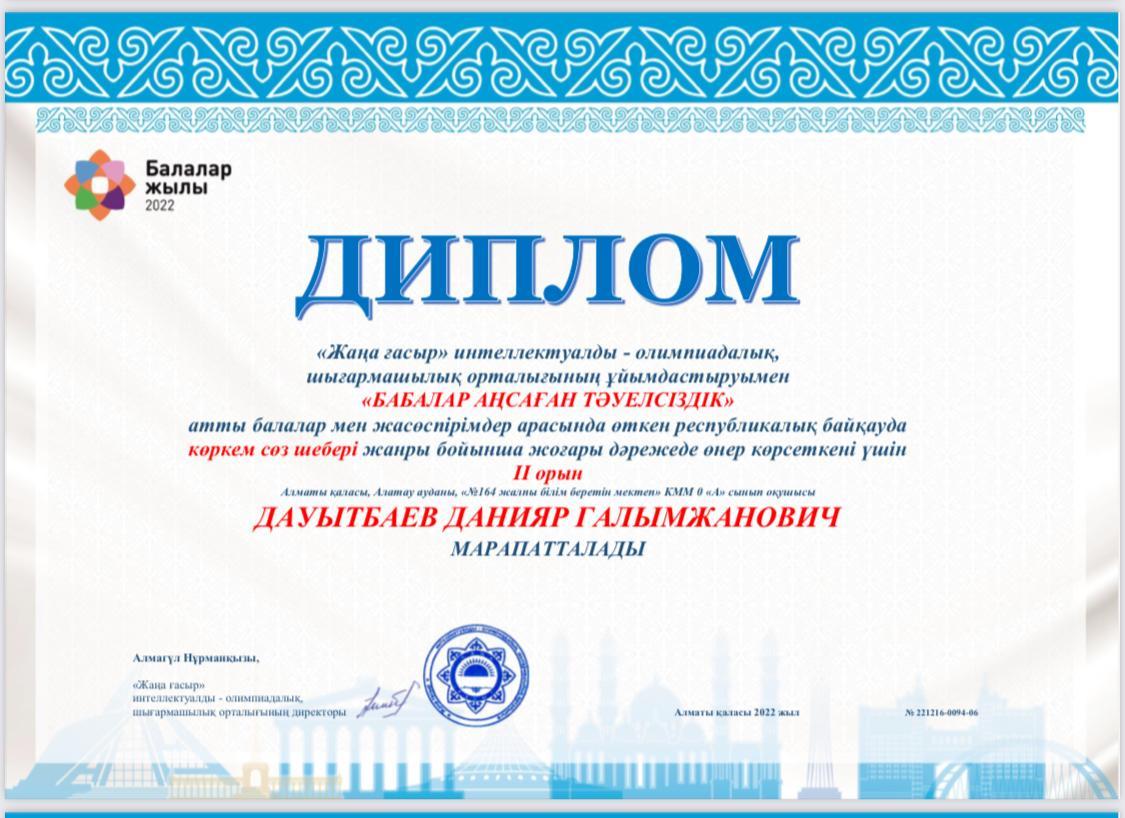 №164 Жалпы білім беретін мектеп » Ақпарат » "Бабалар аңсаған тәуелсіздік" атты республикалық байқауда БЕЙНЕЛЕУ ӨНЕРІ, КӨРКЕМ СӨЗ ШЕБЕРІ жанры бойынша мектепалды даярлық тобының оқушылары қатысып, І орын М.Талғат, А.Самат; ІІ орын І.Сұлтанбек, Д.Дауытбаев,А.Дамирұлы; ІІІ орын Н.Жекен