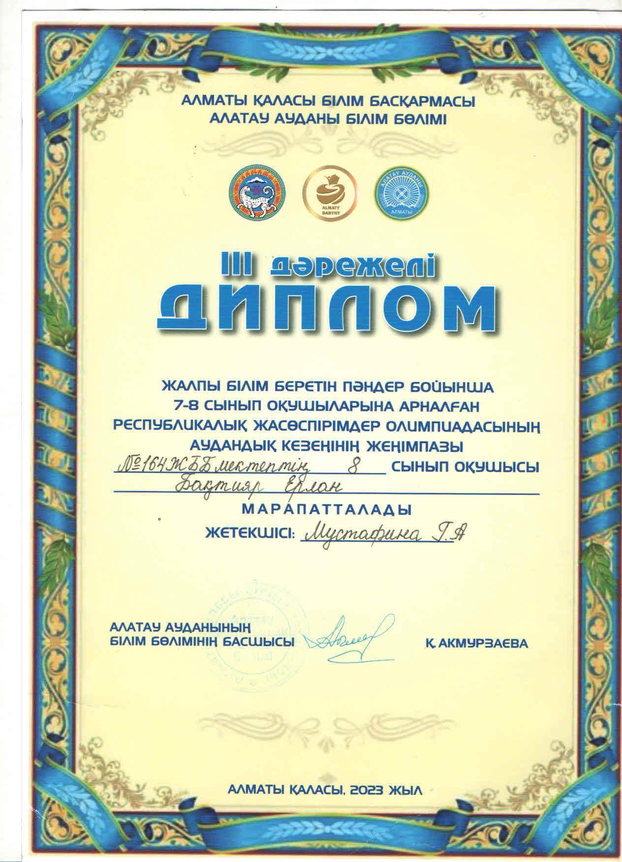 №164 Жалпы білім беретін мектеп » Ақпарат » 7-8 сынып оқушыларына арналған республикалық жасөспірімдер олимпиадасының аудандық кезеңіне ағылшын тілі пәнінен 8 "А" сынып оқушысы Е.Бақтияр қатысып, жүлделі ІІІ орынға ие болды.