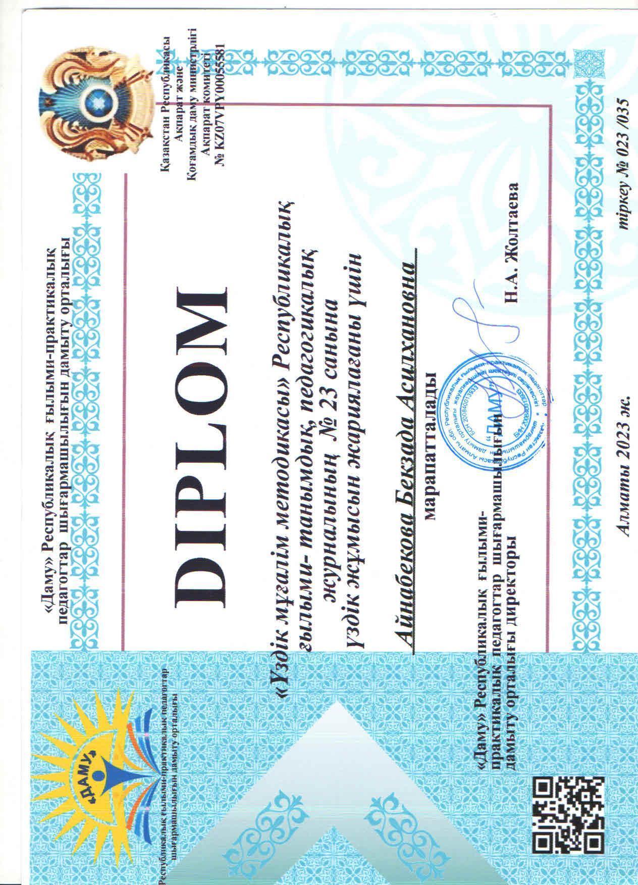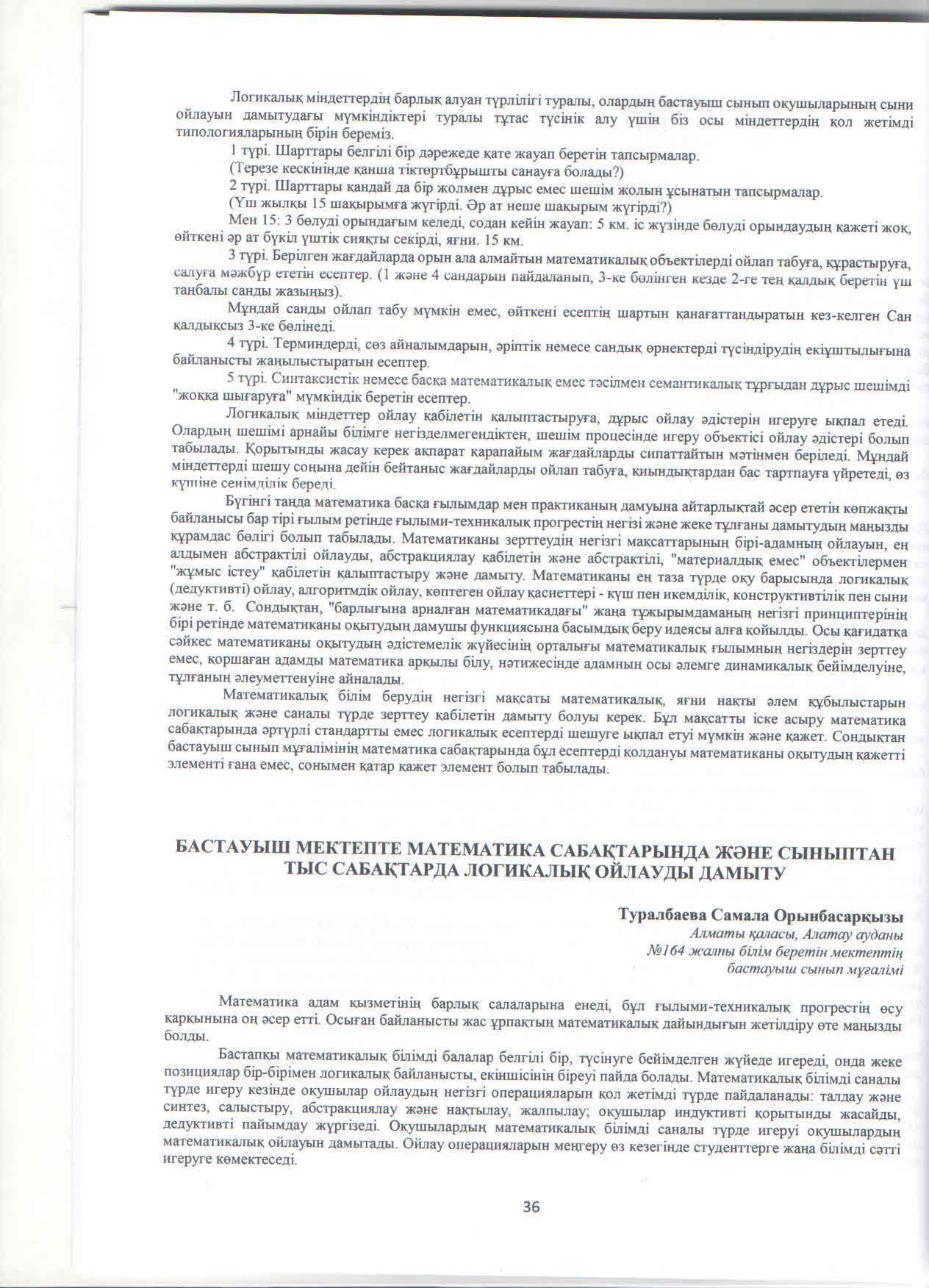 "Үздік мұғалім методикасы" атты республикалық, ғылыми-танымдық педагогикалық журналына бастауыш сынып мұғалімі Б.Айнабекованың "Бастауыш сыныптарда математика сабақтарында логикалық есептерді қолдану" тақырыбында мақаласы шықты