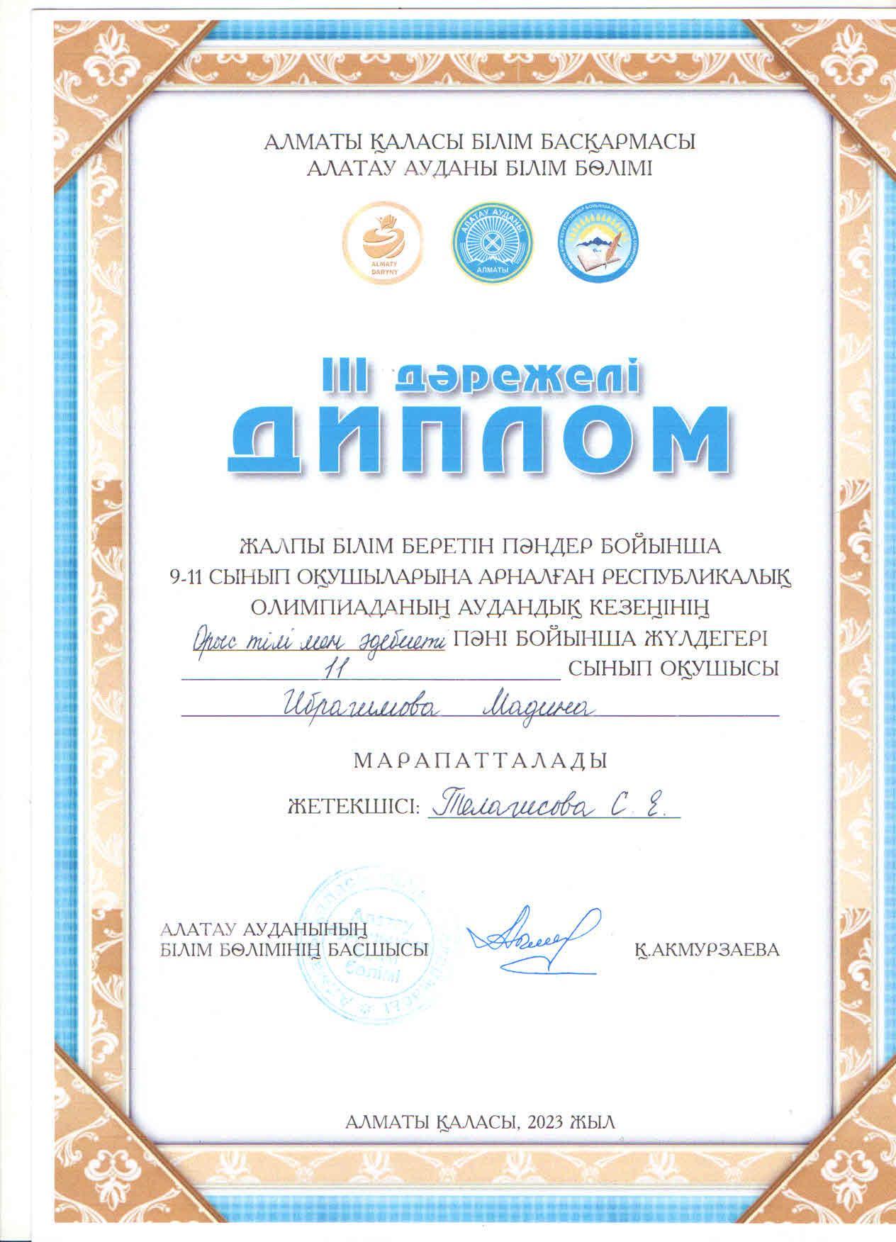 №164 Жалпы білім беретін мектеп » Ақпарат » 9-11 сынып оқушыларына арналған Республикалық олимпиаданың аудандық кезеңіне ОРЫС ТІЛІ мен ӘДЕБИЕТІ пәні бойынша 9 "Ә" сынып оқушысы Пазылбек Нұрсая қатысып, жүлделі ІІІ орынға ие болды. Жетекшісі орыс тілі мен әдебиеті пәні мұғалімі