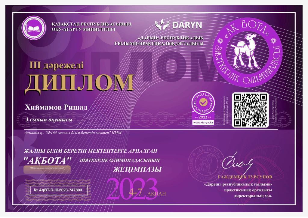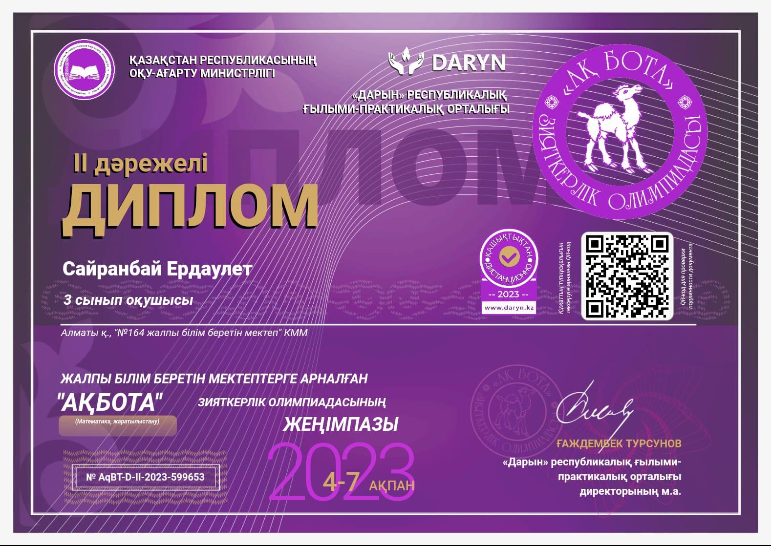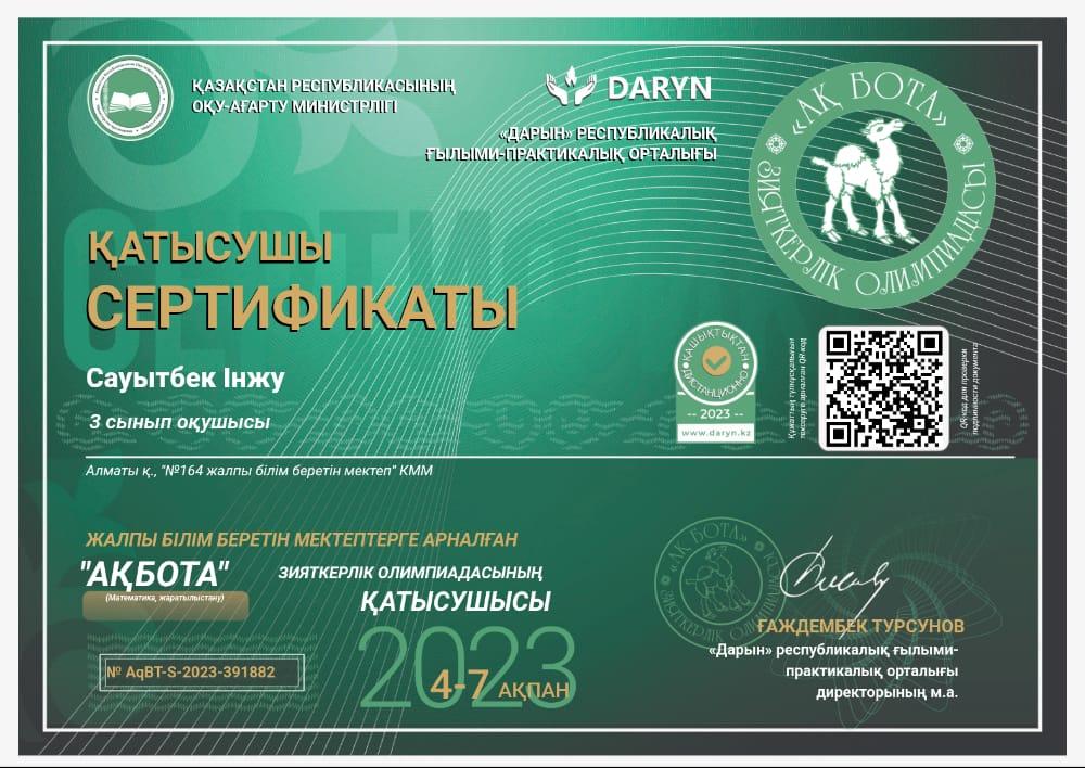 АҚБОТА зияткерлік олимпиадасына 3 "А" сынып оқушылары қатысып, 1 орын Н.Сайрамбай; 2 орын А.Бауыржан, Е.Сайранбай; 3 орын Н.Жұмабек, І.Сауытбек, Р.Хиймамов, сертификат иегері А.Бақберген Жетекшісі бастауыш сынып мұғалімі Д.Сағындықова.