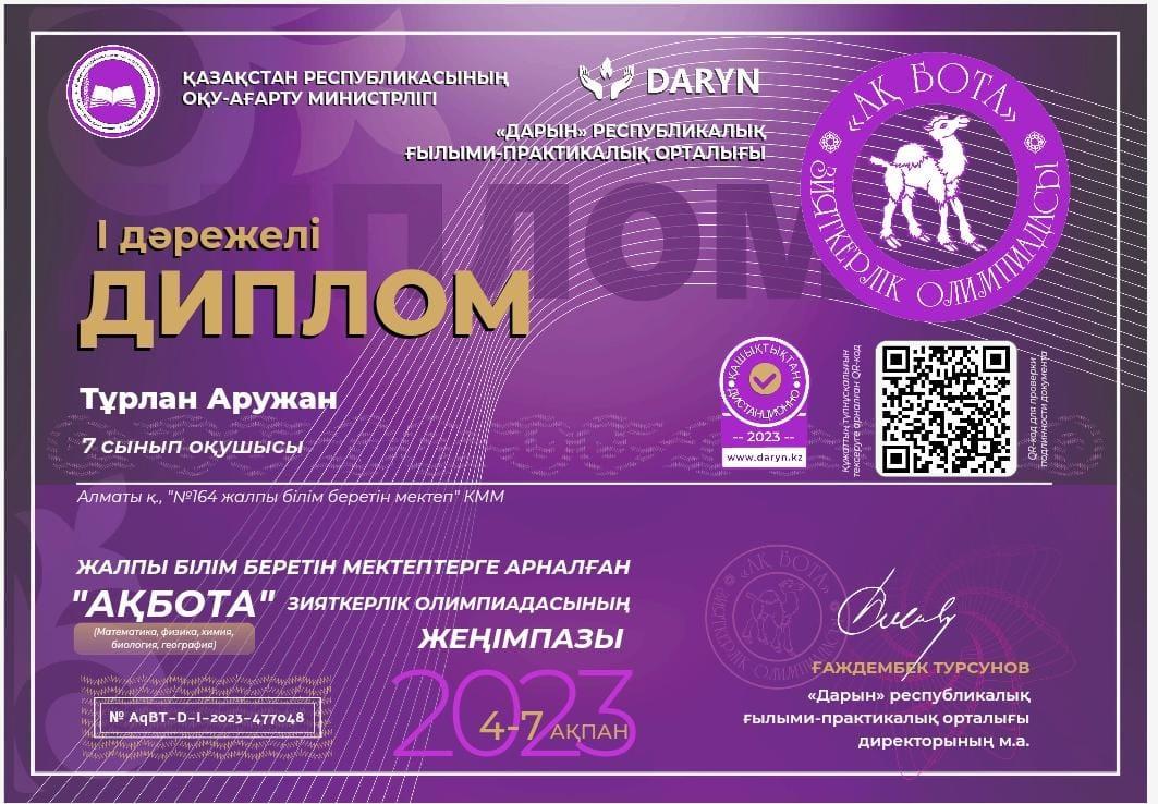№164 Жалпы білім беретін мектеп » Ақпарат » "Дарын" республикалық ғылыми-практикалық орталығы өткізген АҚБОТА зияткерлік олимпиадасына 7 сынып оқушылары қатысып, 1 орын А.Тұрлан, Ж.Төлеу, А.Талғатқызы 2 орын Е.Жақып. Жетекшісі химия пәні мұғалімі М.Кинаятова.