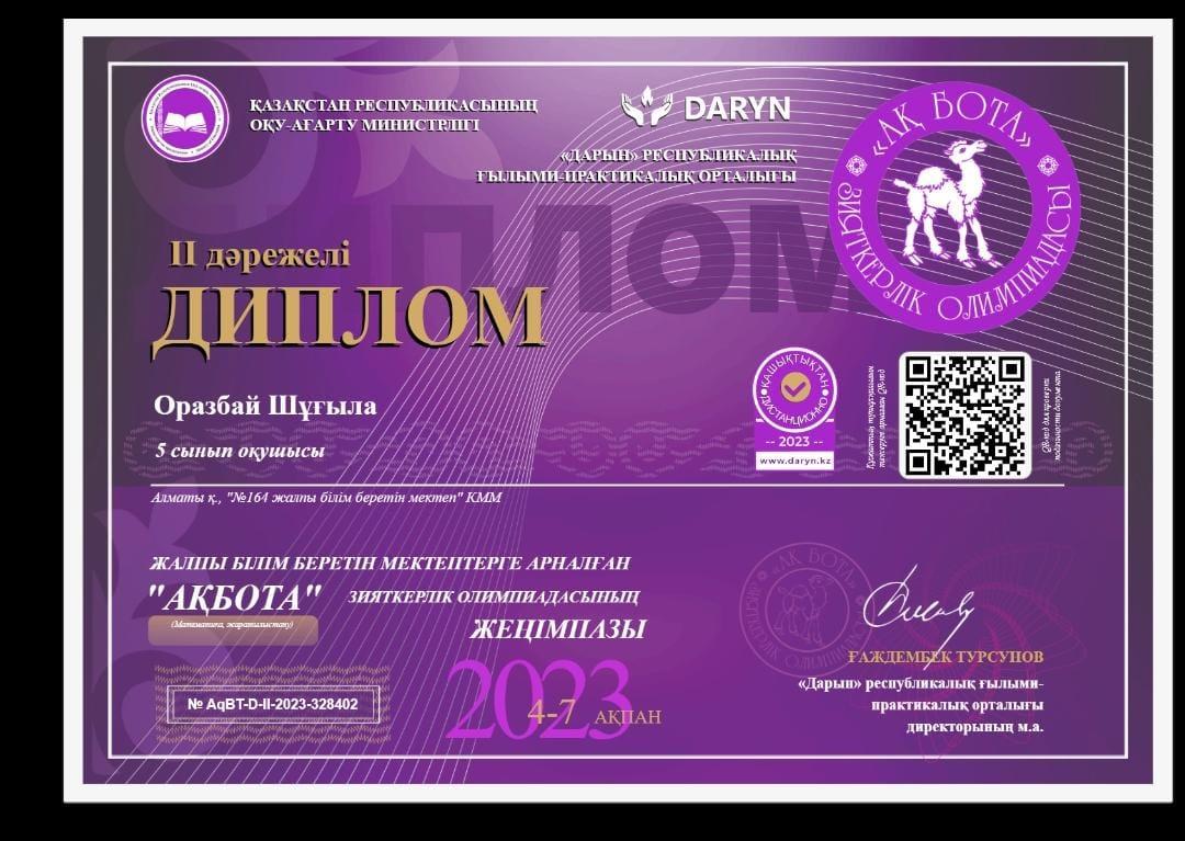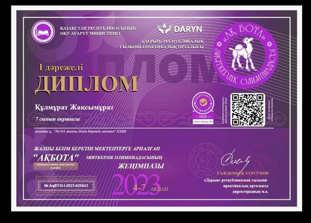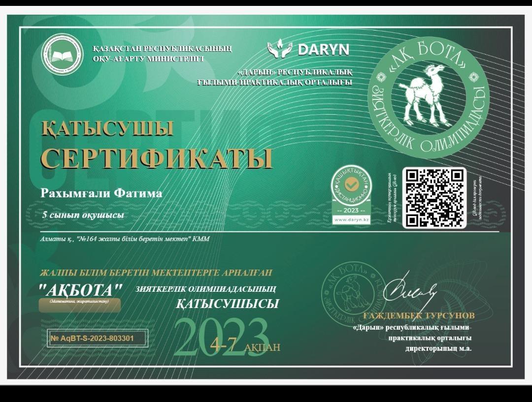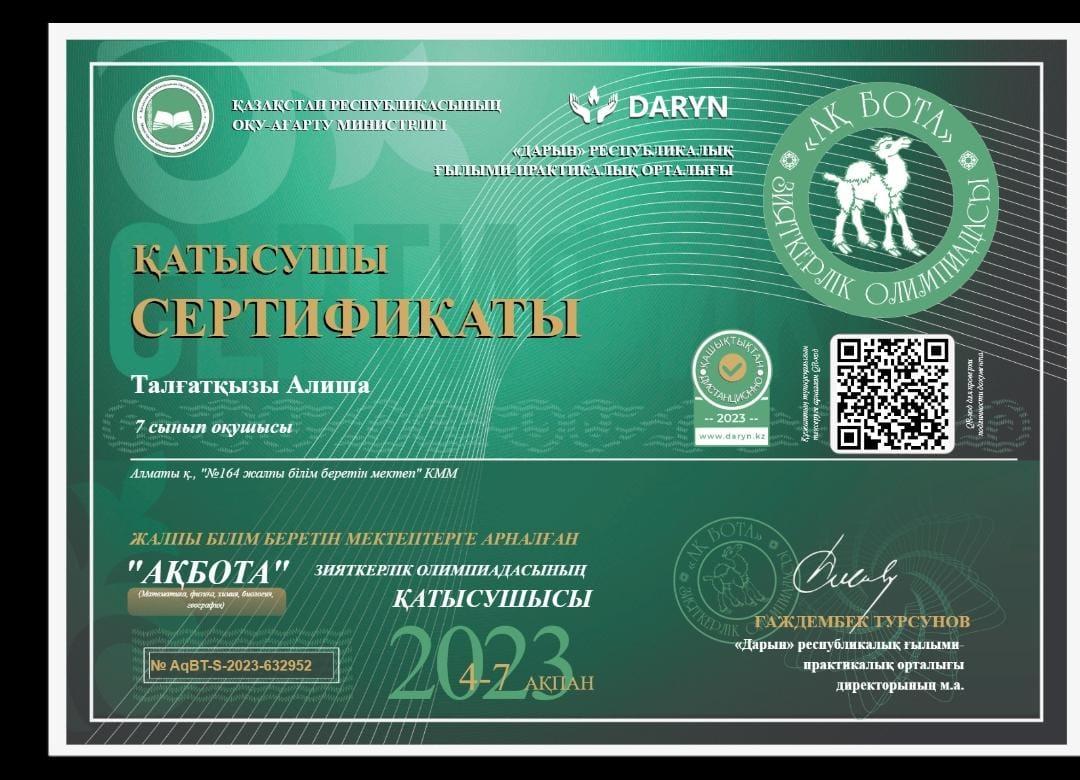 АҚБОТА зияткерлік олимпиадасына 7 сынып оқушылары Ж.Құлмұрат, А.Талғатқызы- 1 орын, 5 сынып Н.Самылтыров, А.Жанат , А.Аймаханов, Ш.Оразбай, Ф.Рахымғали, Т.Диас, И Фафролов 2 орынға ие болды. Жетекшісі география пәні мұғалімі А.Алтаева