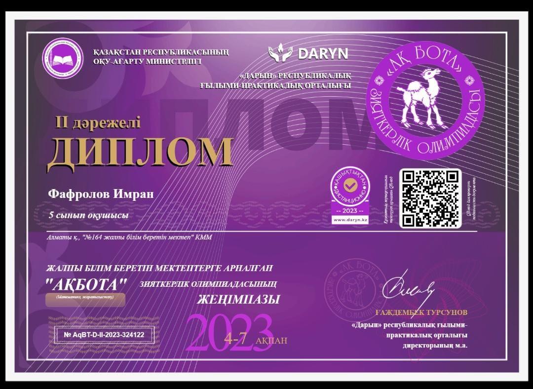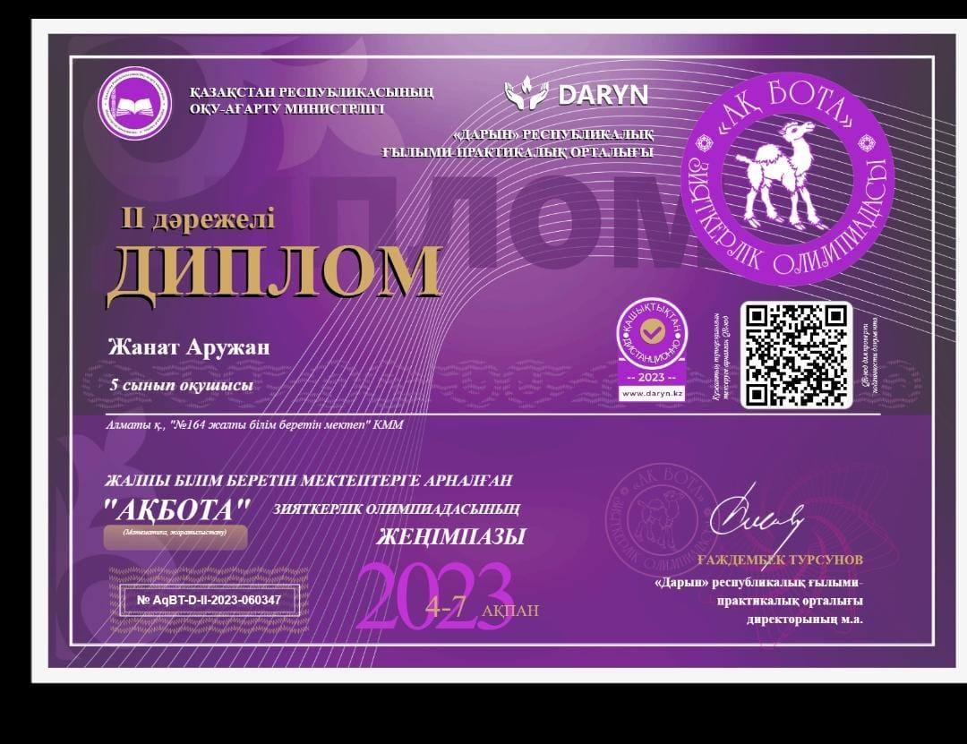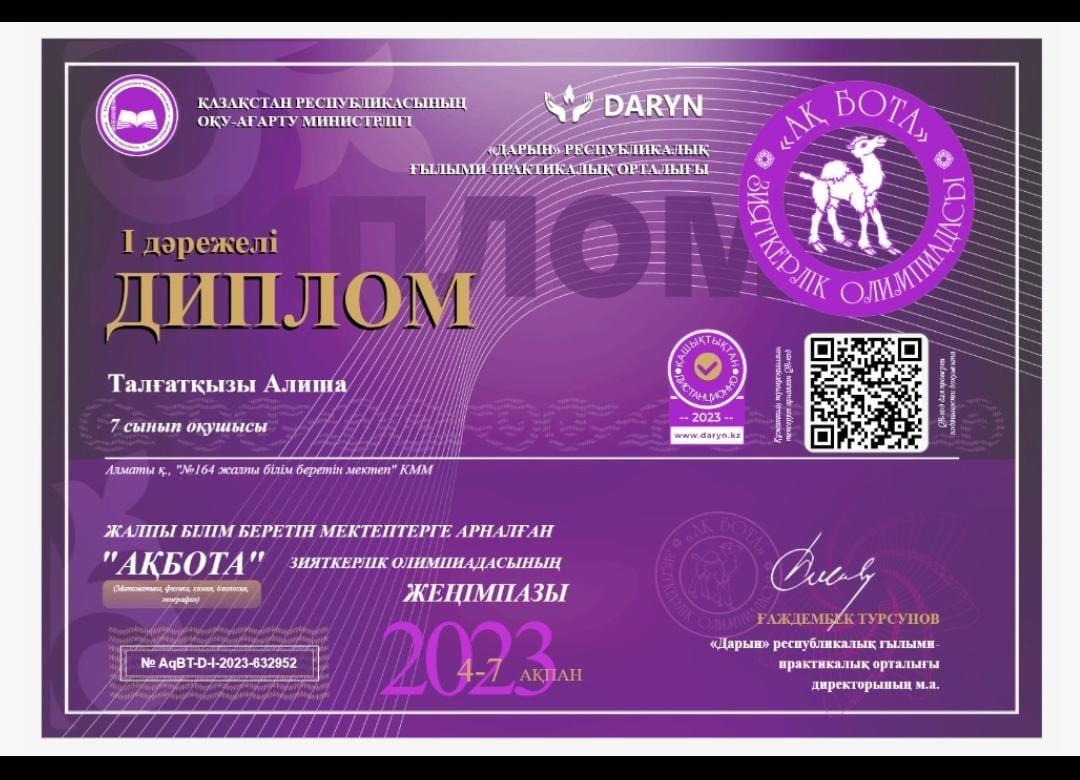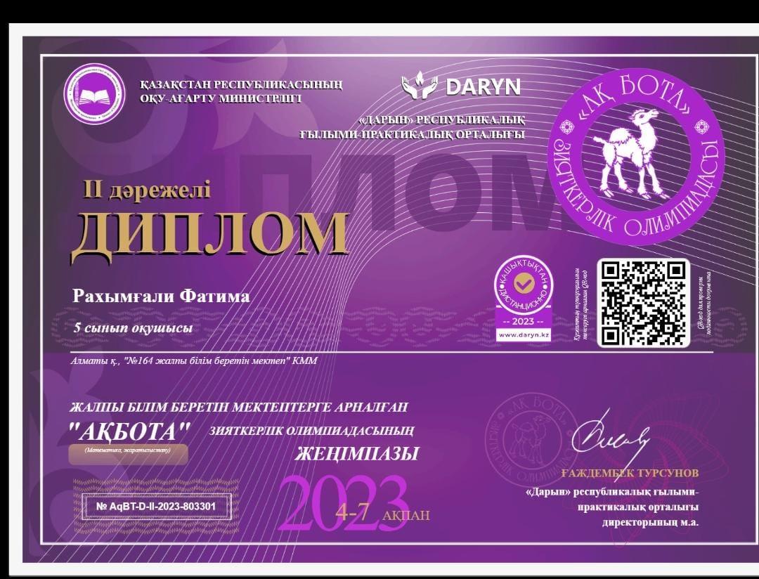 АҚБОТА зияткерлік олимпиадасына 7 сынып оқушылары Ж.Құлмұрат, А.Талғатқызы- 1 орын, 5 сынып Н.Самылтыров, А.Жанат , А.Аймаханов, Ш.Оразбай, Ф.Рахымғали, Т.Диас, И Фафролов 2 орынға ие болды. Жетекшісі география пәні мұғалімі А.Алтаева