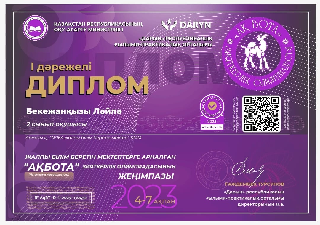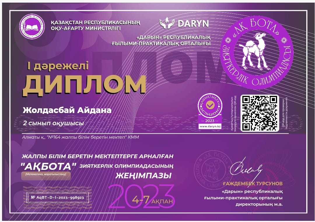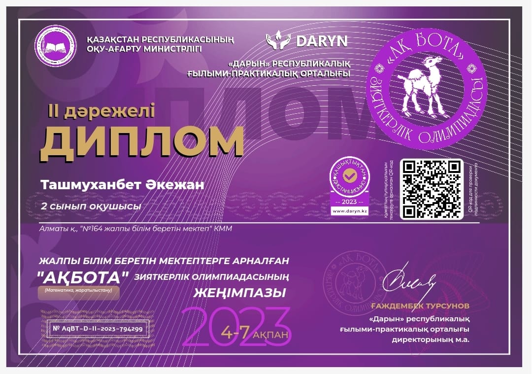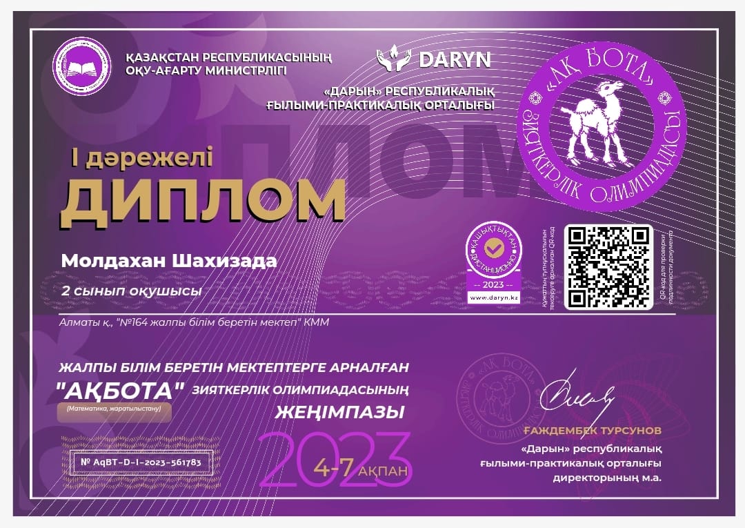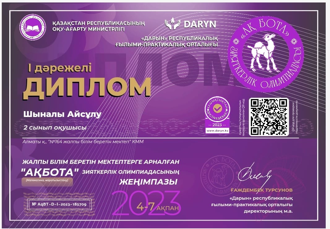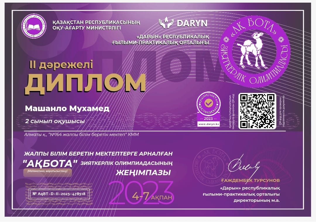 20 ақпан 2023 АҚБОТА зияткерлік олимпиадасына 2 "А" сынып оқушылары Қ.Бектемір, Е.Орынбасар, Е.Нұрлан, Т.Машанло, Ш.Молдахан, А.Отарғали, Л.Бекежанқызы, А.Шыналы, А.Жолдасбай, А.Берден,А.Қуантай,А.Харсанова,А.Шералы,І.Мыңжасар- 1 орын,Ә.Ташмуханбет,М.Машанло