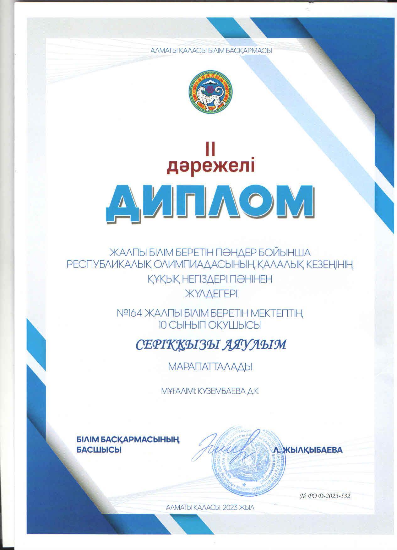 №164 Жалпы білім беретін мектеп » Ақпарат » 9-11 сынып оқушыларына арналған Республикалық олимпиаданың ҚАЛАЛЫҚ кезеңіне ҚҰҚЫҚ НЕГІЗДЕРІ пәні бойынша 10 "А" сынып оқушысы Серікқызы Аяулым қатысып, жүлделі ІІ орынға ие болды. Жетекшісі тарих пәні мұғалімі Д.Кузембаева.