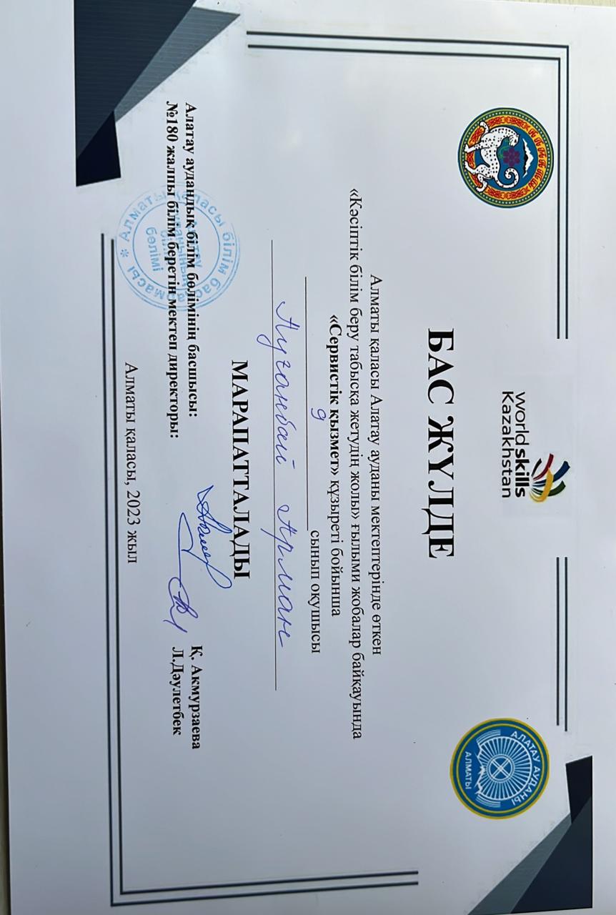 №164 Жалпы білім беретін мектеп » Ақпарат » «Кәсіптік білім беру табысқа жетудің жолы" атты ғылыми жобалар байқауына "СЕРВИСТІК ҚЫЗМЕТ" бағыты бойынша 9 "Ә" сынып оқушысы А.Ауғанбай қатысып, Бас жүлдеге ие болды. Жетекшісі биология пәні мұғалімі К.Оразбаева.