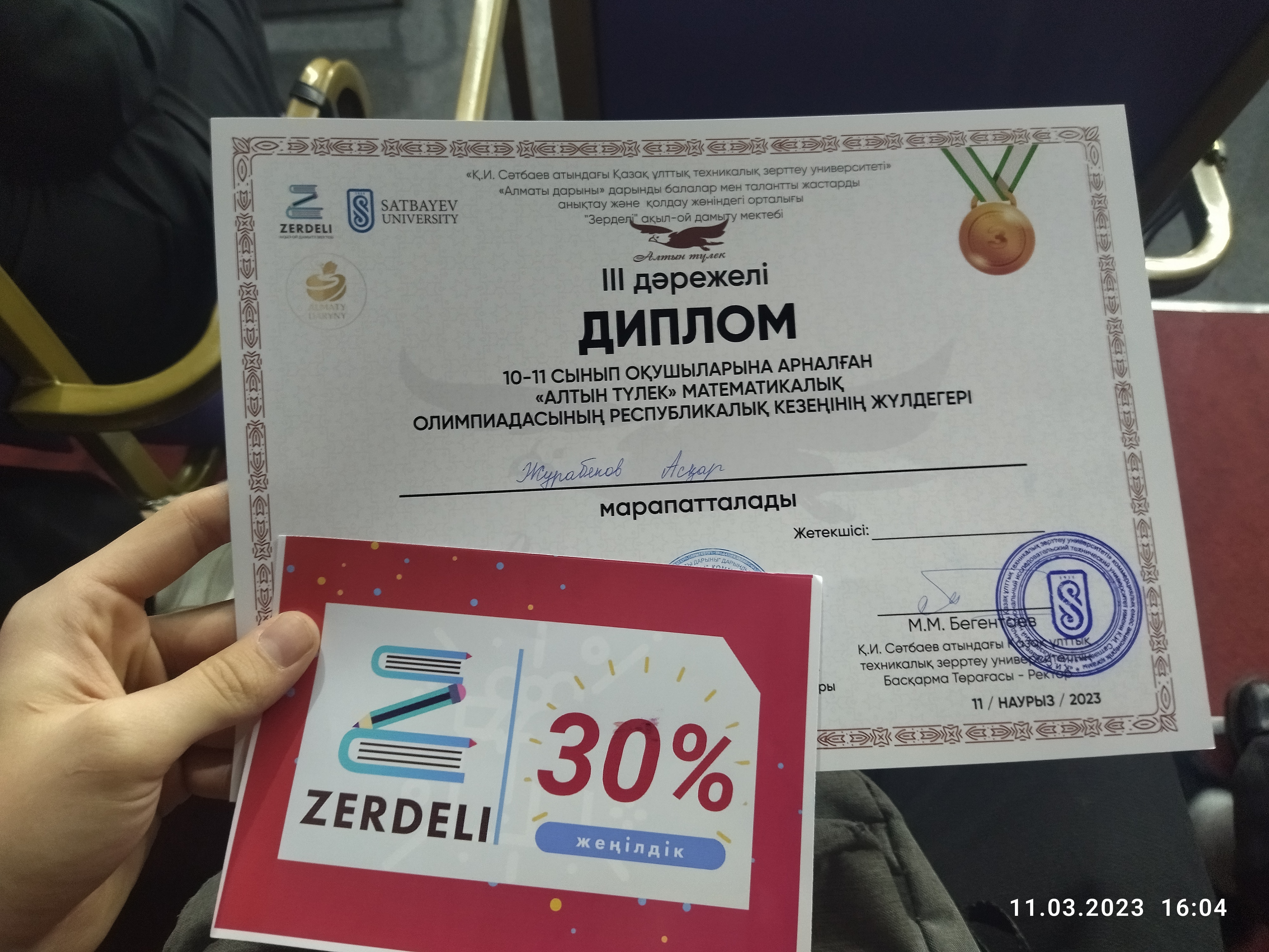 10-11 сынып оқушыларына арналған "АЛТЫН ТҮЛЕК" математикалық олимпиадасының РЕСПУБЛИКАЛЫҚ кезеңінің ІІІ орын иегері 11 "Б" сынып оқушысы Журабеков Асқар. Жетекшісі математика пәні мұғалімі Ж.Абдикерова