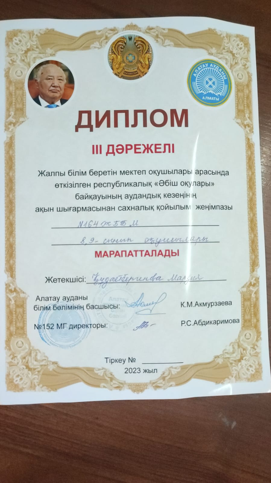 №164 Жалпы білім беретін мектеп » Ақпарат » Республикалық "Әбіш оқулары" байқауының аудандық кезеңіне ақын шығармасынан сахналық қойылым номинациясы бойынша мектебіміздің 8-9 сынып оқушылары жүлделі ІІІ орынға ие болды. Жетекшісі қазақ тілі мен әдебиеті пәні мұғалімі М.Құдайбергенова