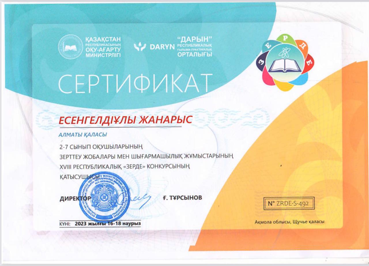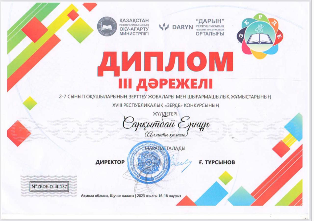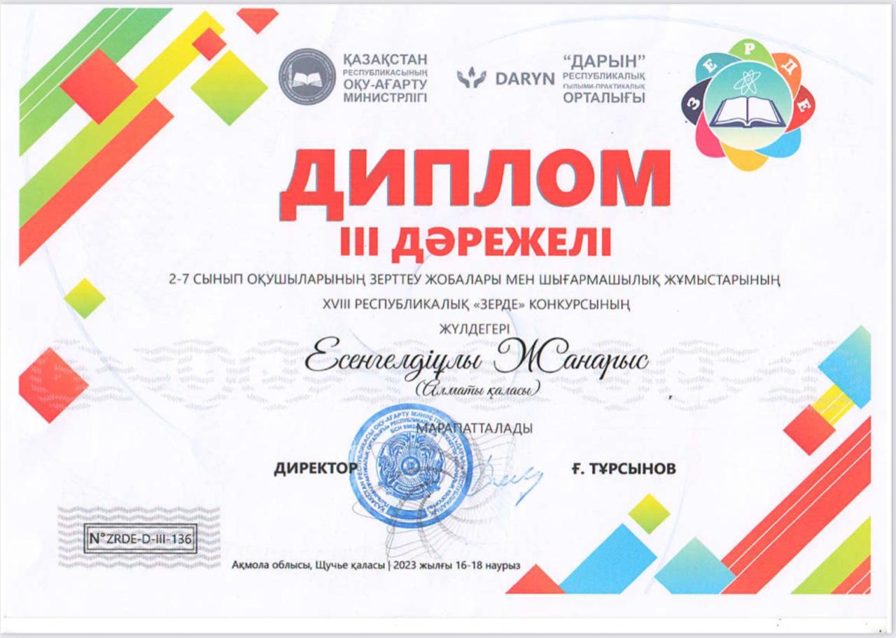 2-7 сынып оқушыларының зерттеу жұмыстары мен шығармашылық жобаларының "ЗЕРДЕ" республикалық конкурсының РЕСПУБЛИКАЛЫҚ кезеңінің "Тарих, өлкетану" секциясы бойынша ІІІ орын иегерлері 7 "А" сынып оқушылары Ж.Есенгелдұлы мен Е.Сарқытбай.