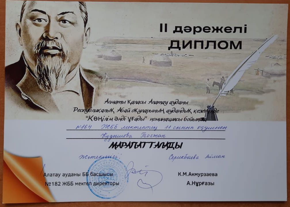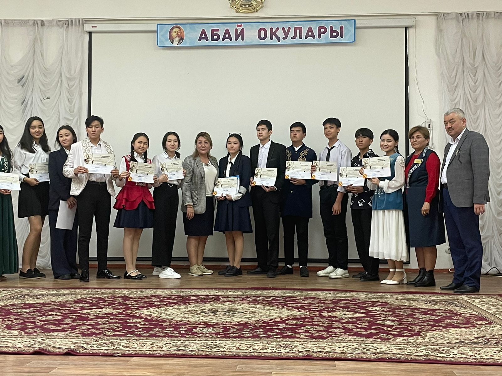 Республикалық Абай оқулары байқауының аудандық кезеңінде "Көңілім әнді ұғады" номинациясы бойынша 11 "Б" сынып оқушысы Т.Кудышова қатысып, жүлделі ІІ орынға ие болды. Жетекшісі музыка пәні мұғалімі А.Серикбаева