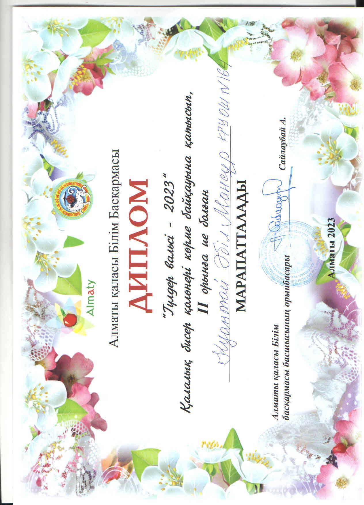 "Гүлдер вальсі-2023" қалалық бисер қолөнері көрме байқауының ІІ орын иегері 5 "Б" сынып оқушысы Қуантай Әбіл Мансұр. Жетекшісі технология пәні мұғалімі Р.Дюсебекова.