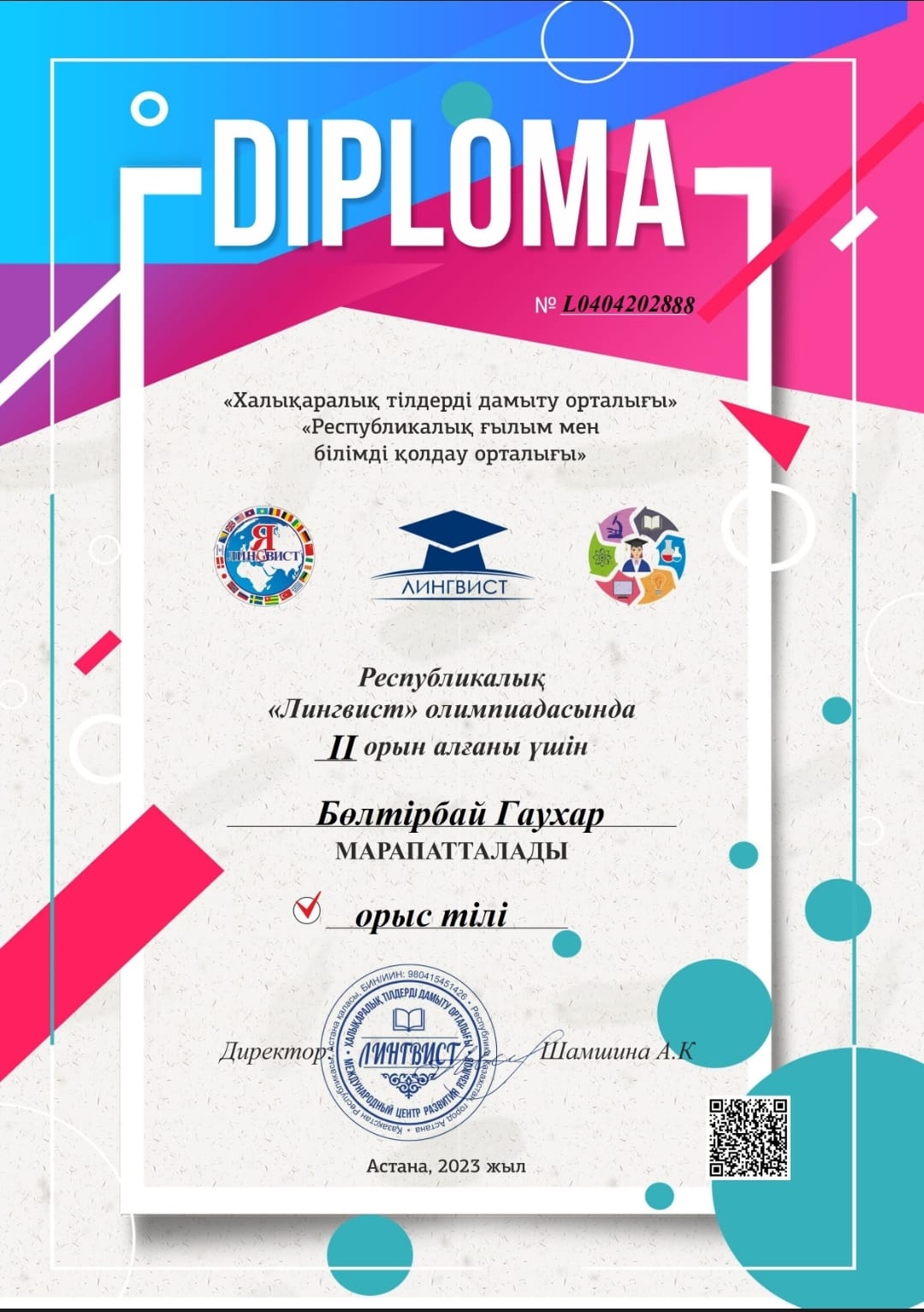 Республикалық "ЛИНГВИСТ" олимпиадасына орыс тілі пәнінен 6 сынып оқушылары С.Таукебаев, А.Садуакас, Г.Бөлтірбай, А.Эдик, І.Қидарбек, А.Ахметтер қатысып, жүлделі ІІ орынға ие болды. Жетекшісі, орыс тілі пәні мұғалімі Ш.Мырзабаева