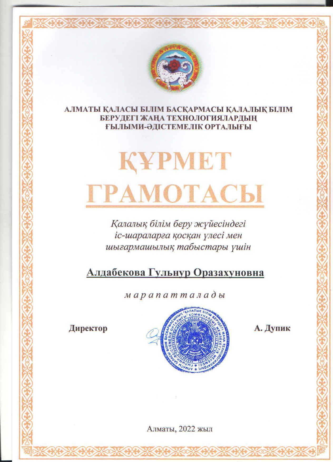 Алматы қаласы Білім басқармасы Қалалық білім берудегі жаңа технологиялардың ғылыми -әдістемелік орталығының Құрмет грамотасымен қазақ тілі мен әдебиеті пәні мұғалімі Г.Алдабекова марапатталды
