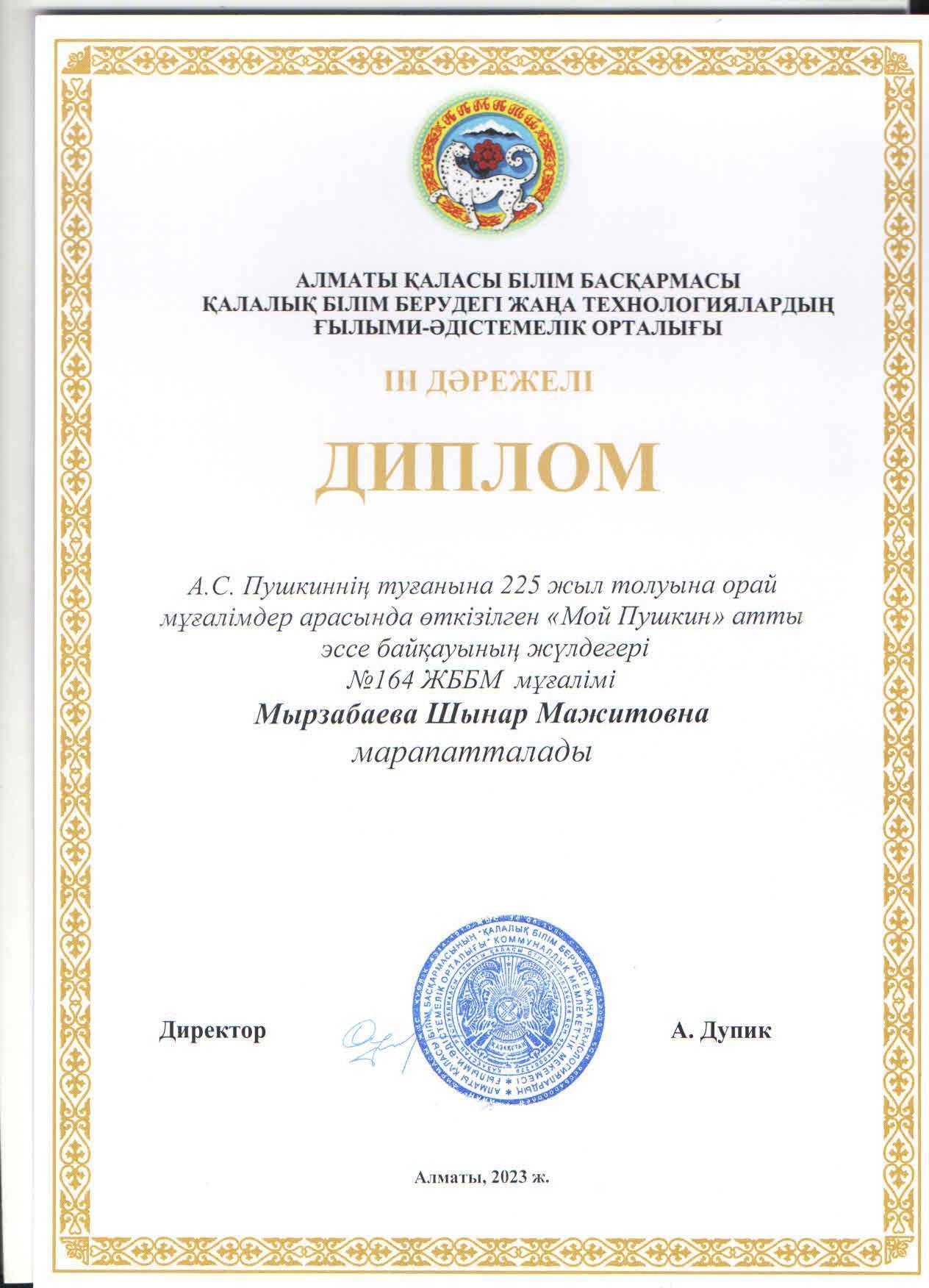 Қалалық білім берудегі жаңа технологиялардың ғылыми-әдістемелік орталығы А.С.Пушкиннің туғанына 225 жыл толуына орай мұғалімдер арасында өткізілген "Мой Пушкин" атты эссе байқауының ІІІ орын иегері орыс тілі мен әдебиеті пәні мұғалімі Ш.Мырзабаева.