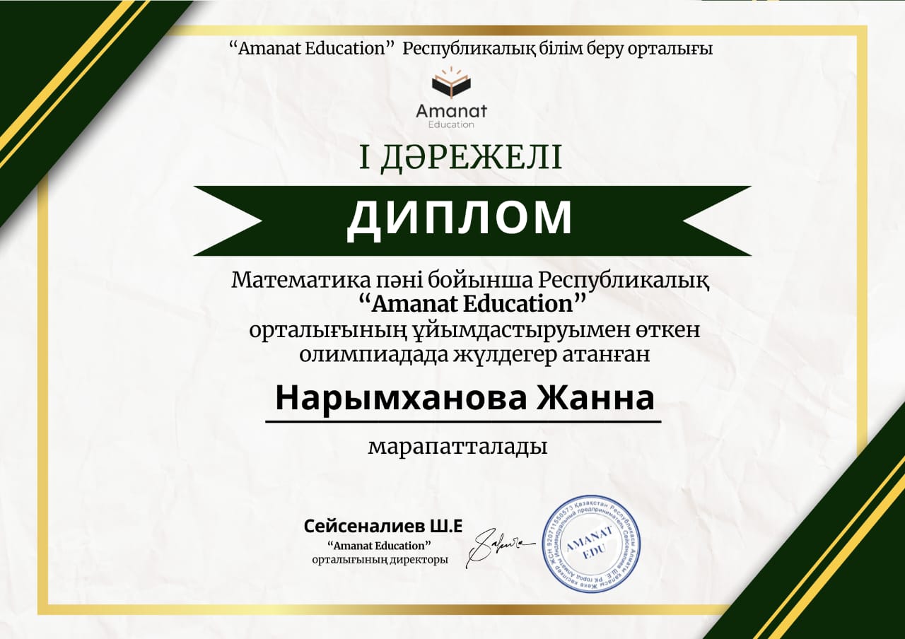 Математика пәні бойынша Республикалық "Amanat Education" орталығының ұйымдастыруымен өткен олимпиадаға 11 сынып оқушылары А.Берик, А.Журабеков, Ж.Нарымханова қатысып, І орынға ие болды. Жетекшісі математика пәні мұғалімі Ж.Абдикерова.