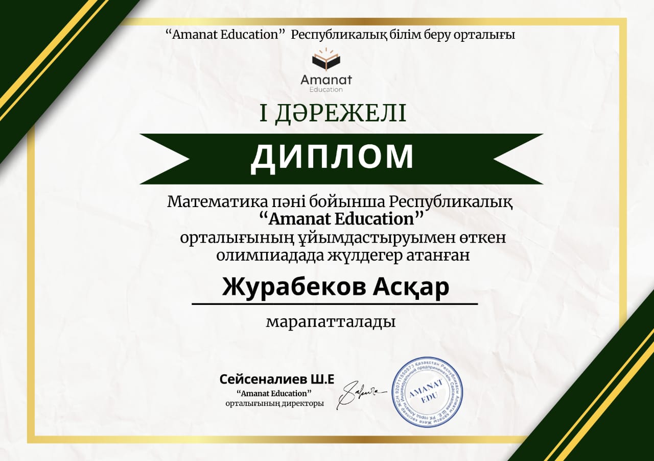 №164 Жалпы білім беретін мектеп » Ақпарат » Математика пәні бойынша Республикалық "Amanat Education" орталығының ұйымдастыруымен өткен олимпиадаға 11 сынып оқушылары А.Берик, А.Журабеков, Ж.Нарымханова қатысып, І орынға ие болды. Жетекшісі математика пәні мұғалімі Ж.Абдикерова.