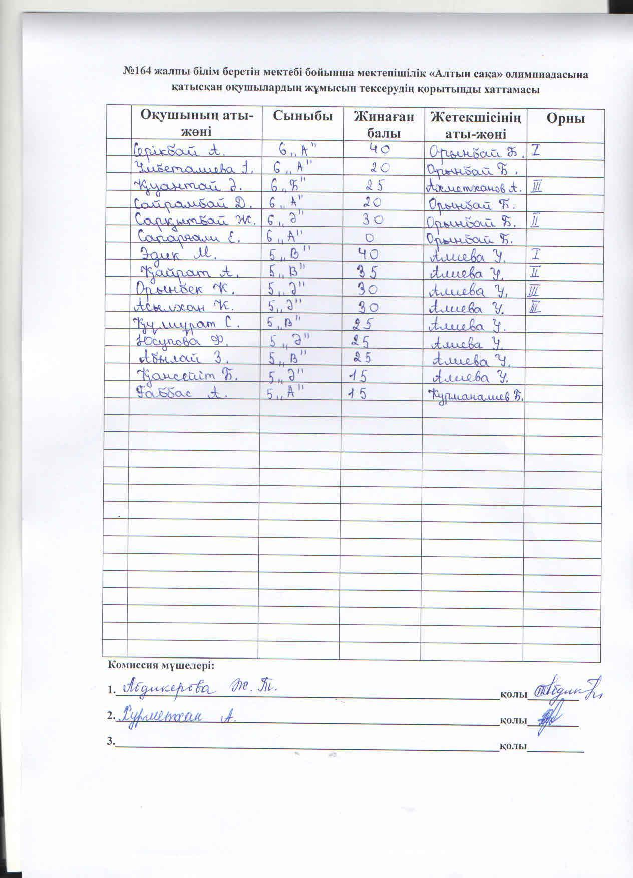 №164 Жалпы білім беретін мектеп » Ақпарат » 29 қыркүйек күні "Алтын сақа" олимпиадасының мектепішілік кезеңі өткізіліп, 6 сыныптардан 6 оқушы, 5 сыныптардан 9 оқушы қатысты. Ең жоғары балл жинаған 6 сыныптан 2 оқушы, 5 сыныптан 2 оқушы аудандық кезеңге жіберілді.