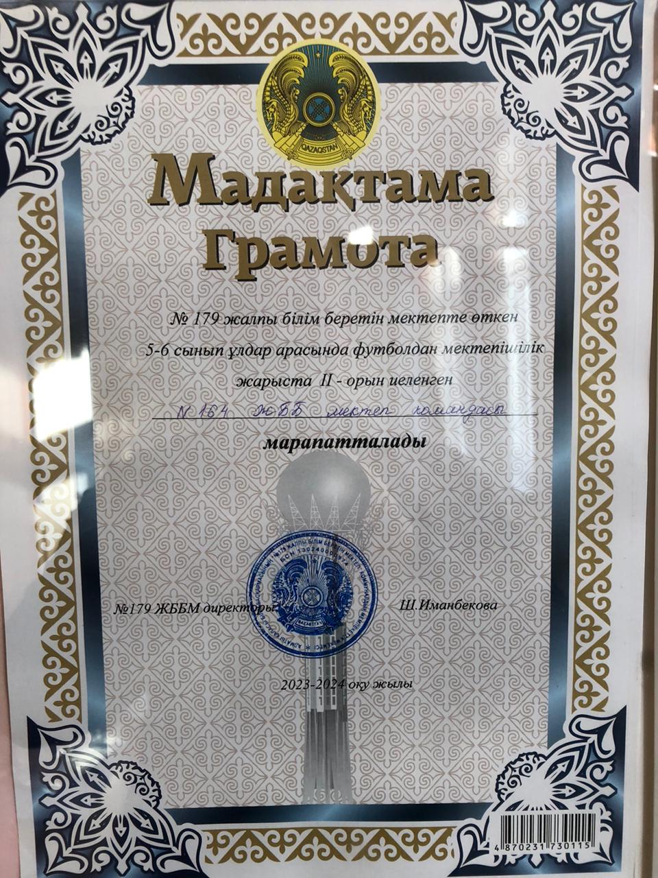 №179 ЖББ мектепте 5-6 сынып ұлдар арасындағы футбол жарысынан мектебіміздің командасы жүлделі ІІ орынға ие болды. Жетекшісі дене шынықтыру пәні мұғалімі А.Сағынай.