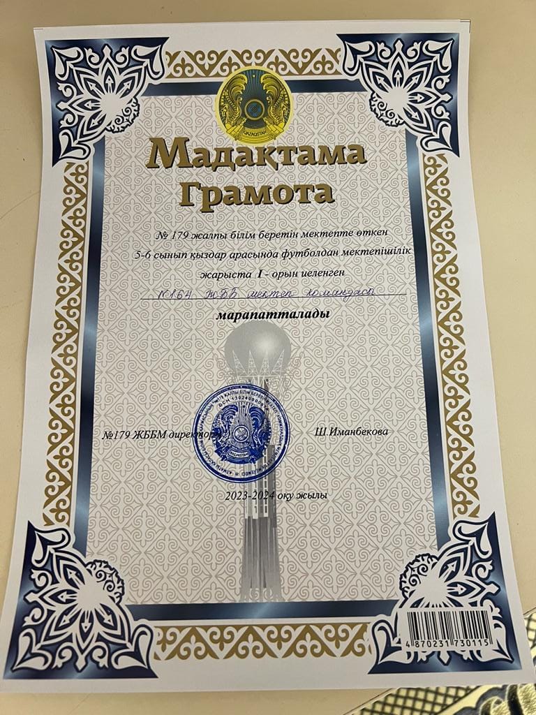 №179 ЖББ мектепте 5-6 сынып қыздар арасындағы футбол жарысынан мектебіміздің командасы жүлделі І орынға ие болды. Жетекшісі дене шынықтыру пәні мұғалімі С.Олжабаев.