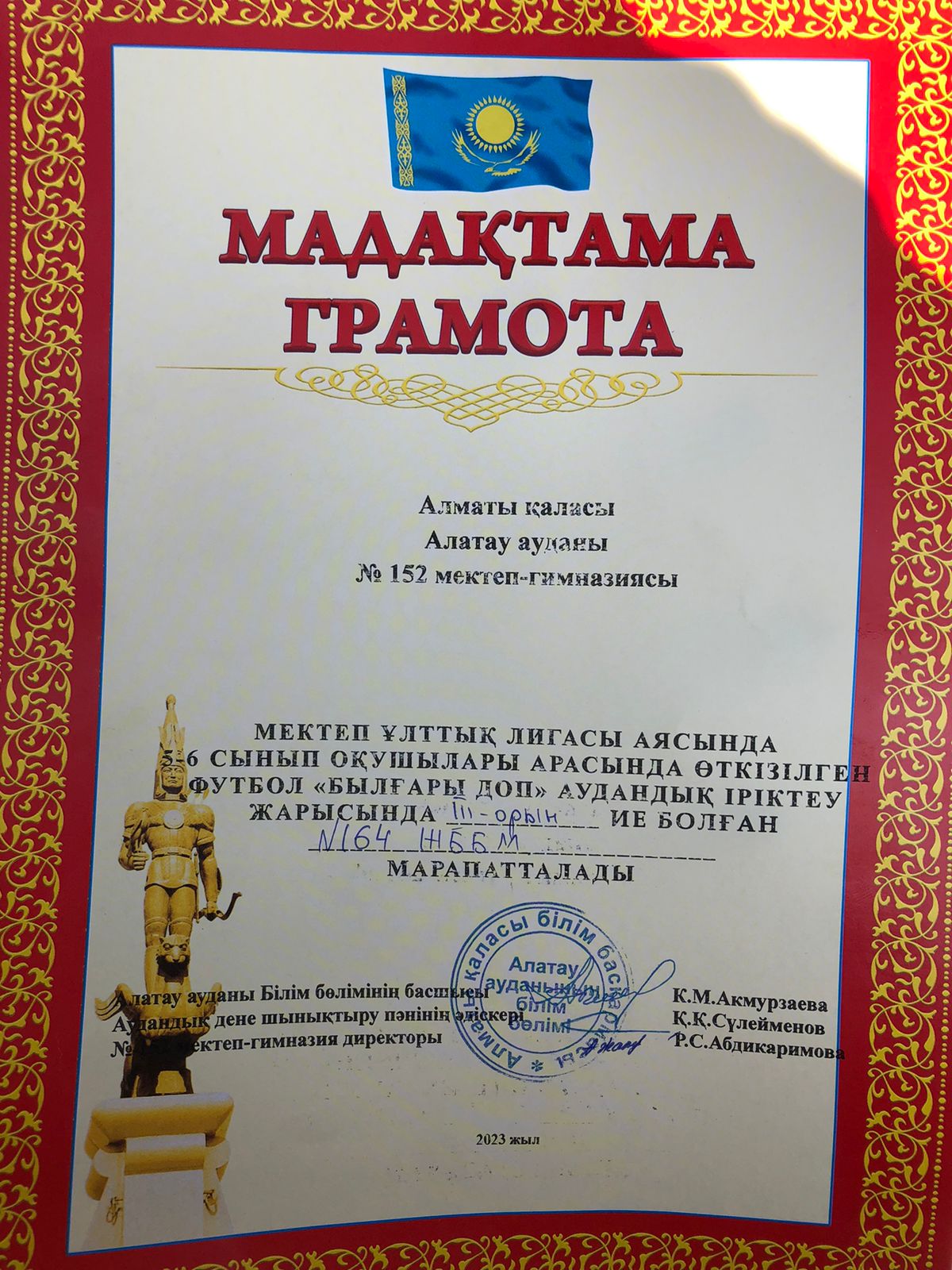 Аудан мектептері арасында 5-6 сынып қыздардың футбол жарысынан мектебіміздің командасы жүлделі ІІІ орынға ие болды. Жетекшісі дене шынықтыру пәні мұғалімі С.Олжабаев пен А.Сағынай.
