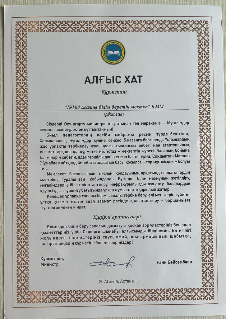 №164 Жалпы білім беретін мектеп » Ақпарат » Мектеп ұжымын Халықаралық мұғалімдер күні мерекесімен Оқу ағарту министрлігі құттықтап, білім беру саласын дамытуға қосқан зор үлесіміз бен адал қызметтеріміз үшін Алғыс хатпен марапаттады.