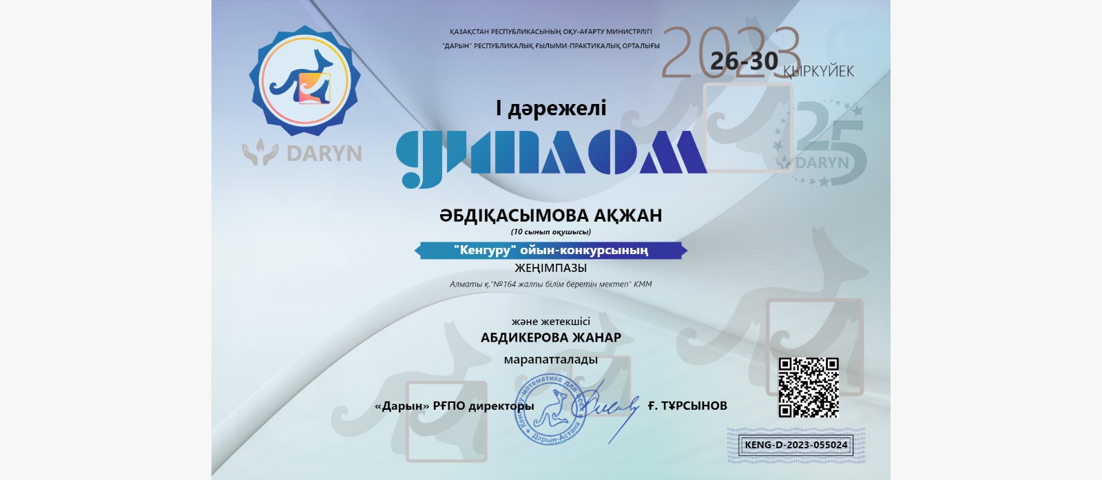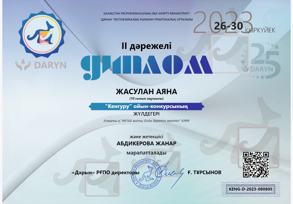 №164 Жалпы білім беретін мектеп » Ақпарат » 2023 жылдың қыркүйек айының 26-30 күндері аралығында Дарын РҒПО “Кенгуру” ойын конкурсына 10 сынып оқушылары қатысып, І орынға А.Дүйсенбек, А.Әбдіқасымова; ІІ орынға А.Жасулан ие болды. Жетекшісі математика пәні мұғалімі Ж.Абдикерова.