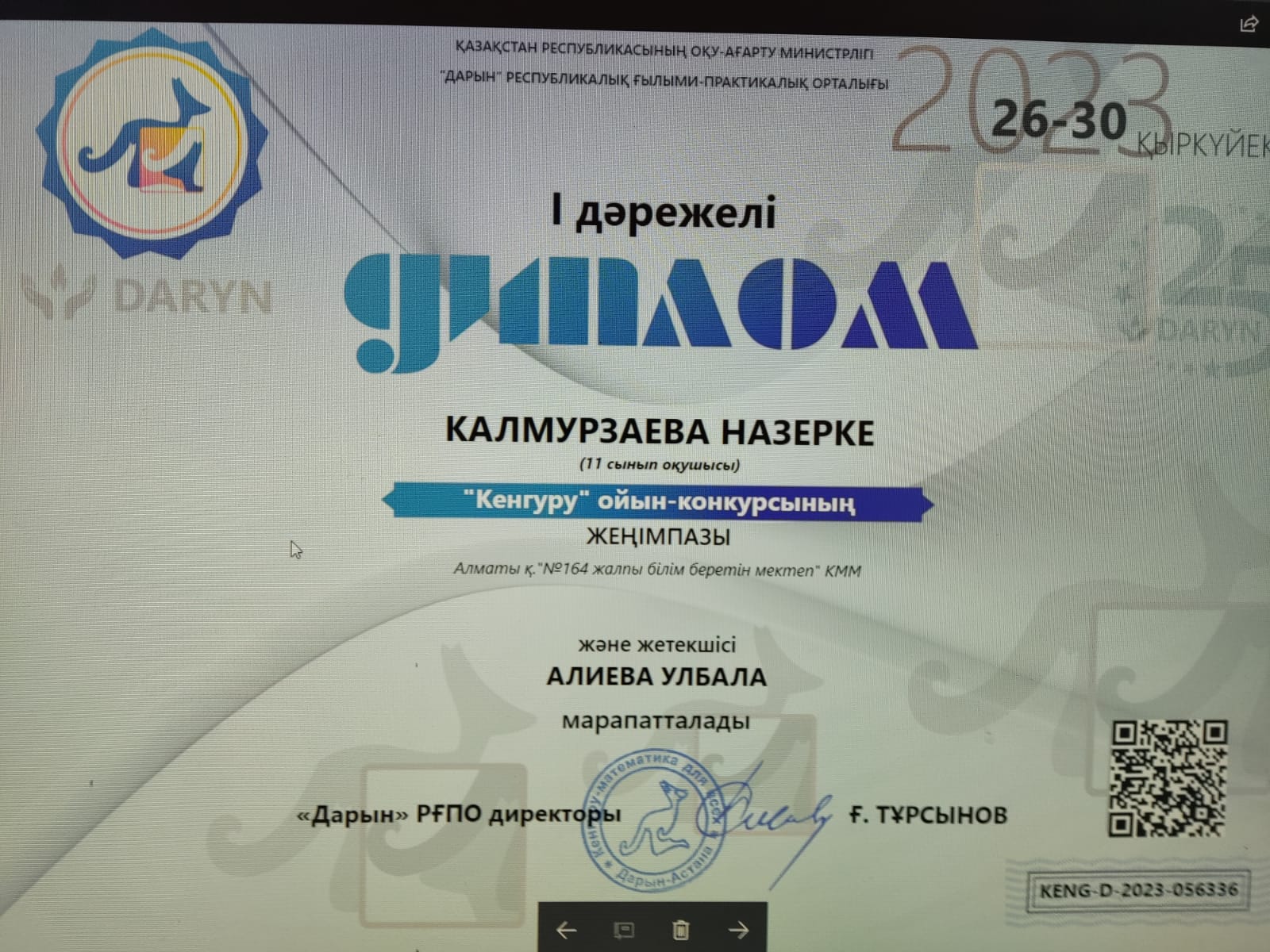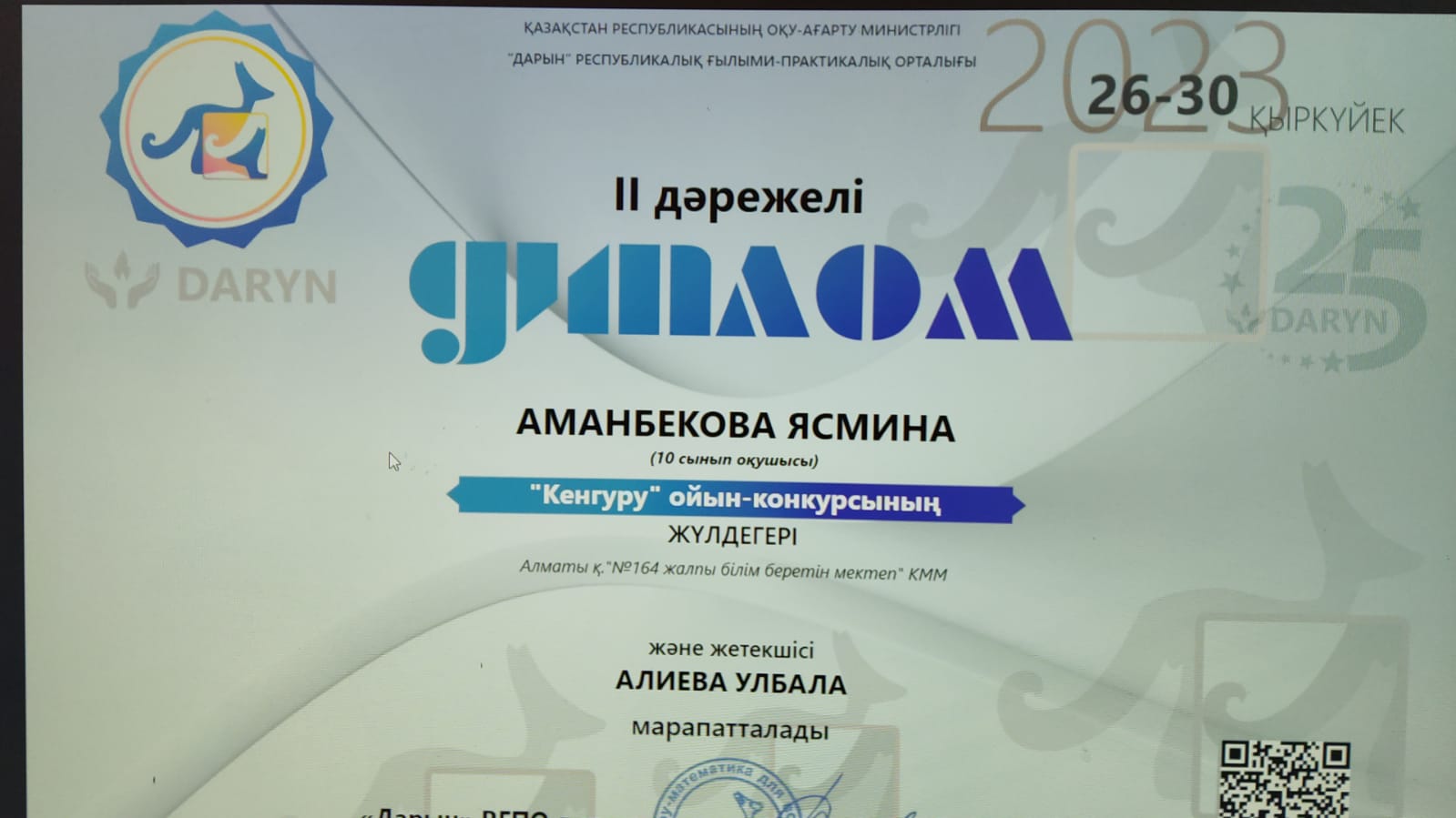 №164 Жалпы білім беретін мектеп » Ақпарат » 2023 жылдың қыркүйек айының 26-30 күндері аралығында Дарын РҒПО “Кенгуру” ойын конкурсына 10 сынып оқушылары Н.Калмурзаева, Я.Аманбекова қатысып, І-ІІ орынға ие болды. Жетекшісі математика пәні мұғалімі У.Алиева