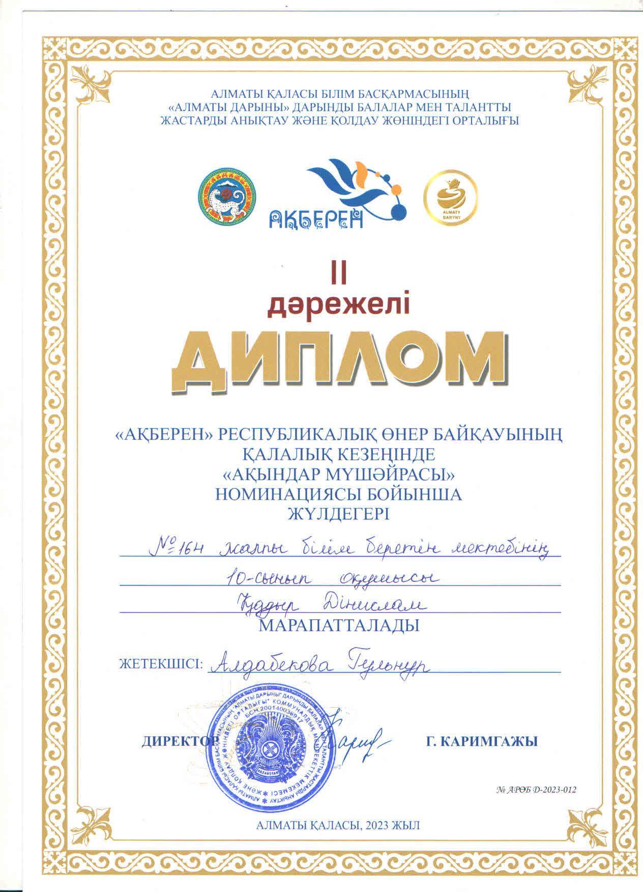 "Ақберен" Республикалық өнер байқауының ҚАЛАЛЫҚ кезеңінде "Ақындар мүшәйрасы" номинациясы бойынша жүлделі ІІ орын иегері болған мектебіміздің 11 сынып оқушысы Д.Қадыр. Жетекшісі қазақ тілі мен әдебиеті пәні мұғалімдері Г.Алдабекова