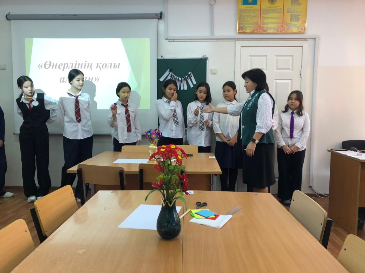 "Еңбекке жастан, өнерге бастан" атты Өнер әдістемелік бірлестігі пәні мұғалімдері онкүндігінде көркем еңбек пәні мұғалімі Р.Дюсебекова 7 сынып оқушыларымен "Өнерлінің қолы алтын" тақырыбында сайыс сабақ өткізді.