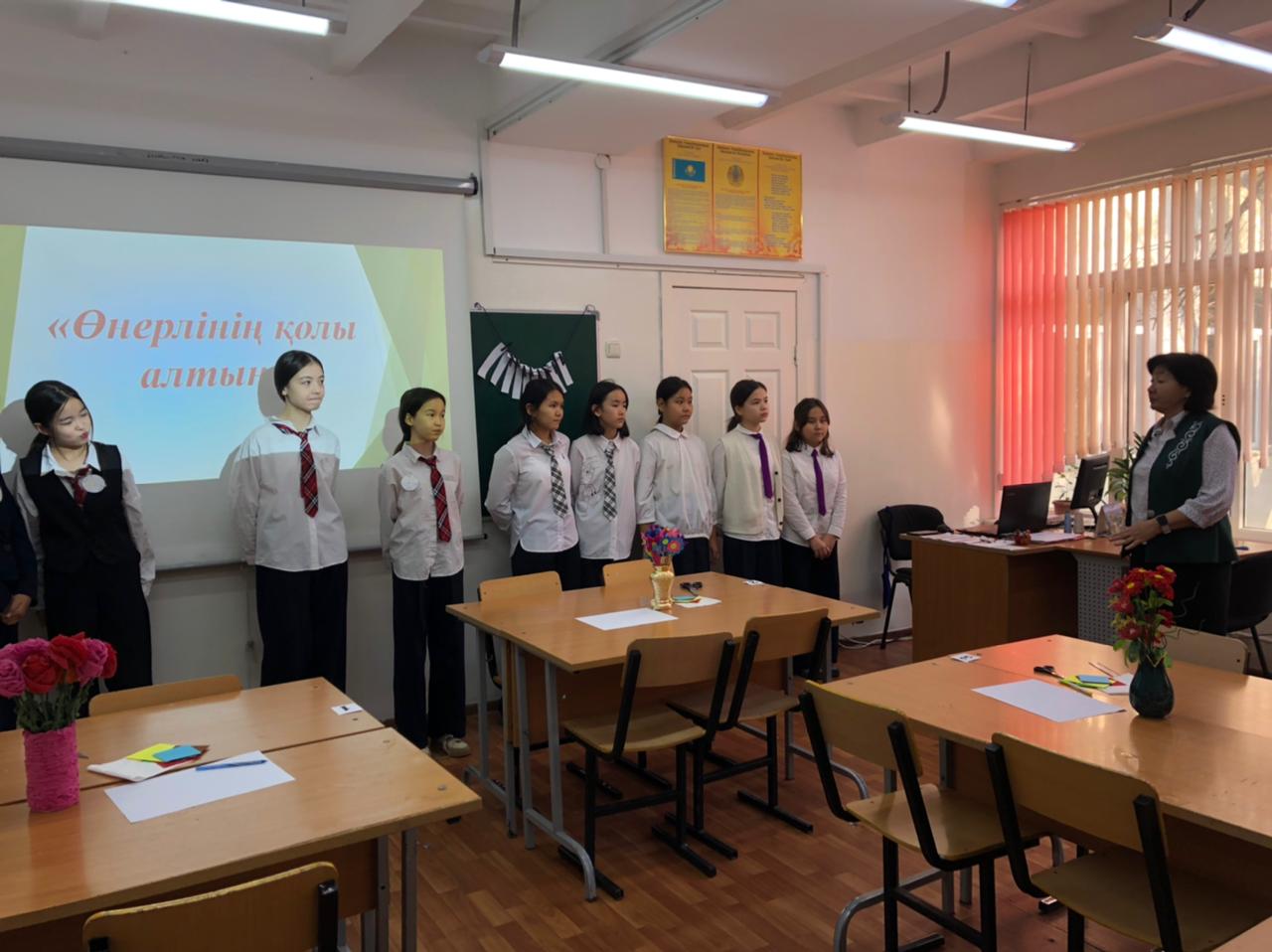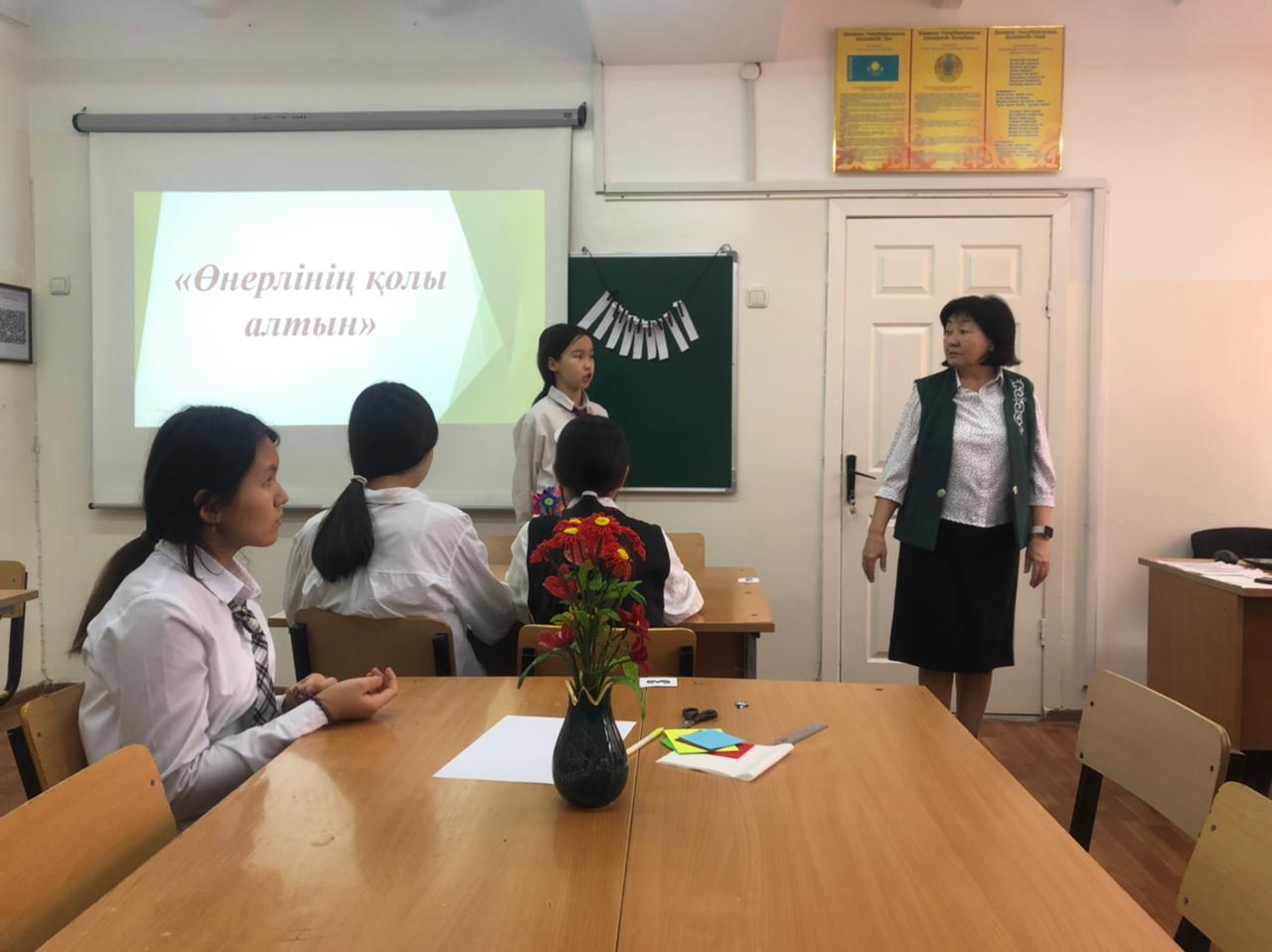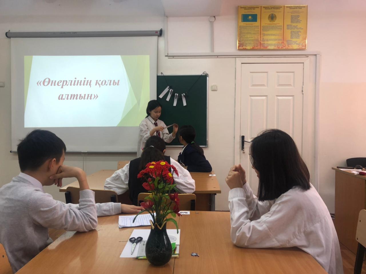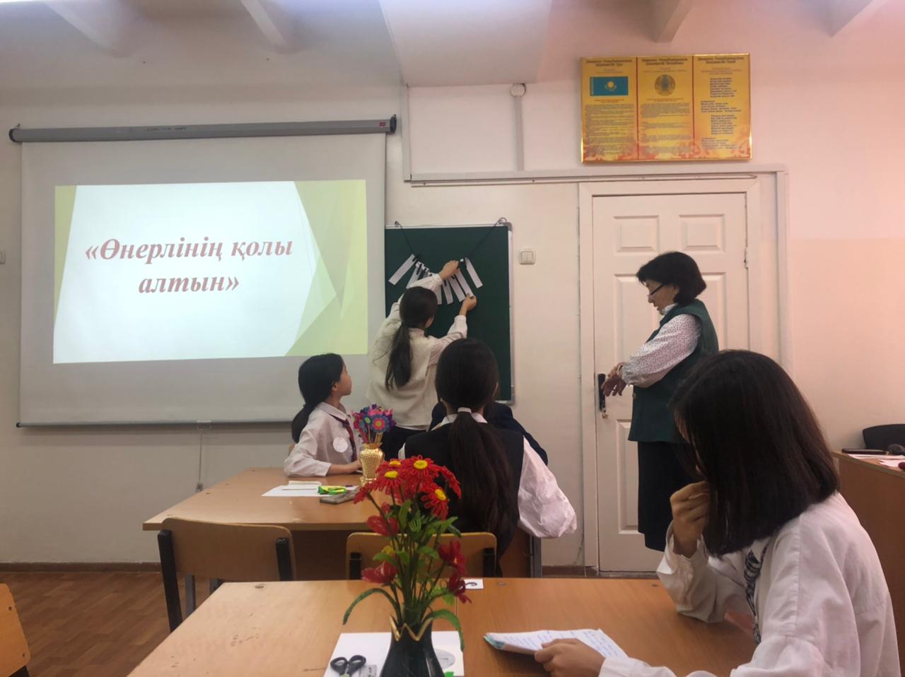 №164 Жалпы білім беретін мектеп » Ақпарат » "Еңбекке жастан, өнерге бастан" атты Өнер әдістемелік бірлестігі пәні мұғалімдері онкүндігінде көркем еңбек пәні мұғалімі Р.Дюсебекова 7 сынып оқушыларымен "Өнерлінің қолы алтын" тақырыбында сайыс сабақ өткізді.