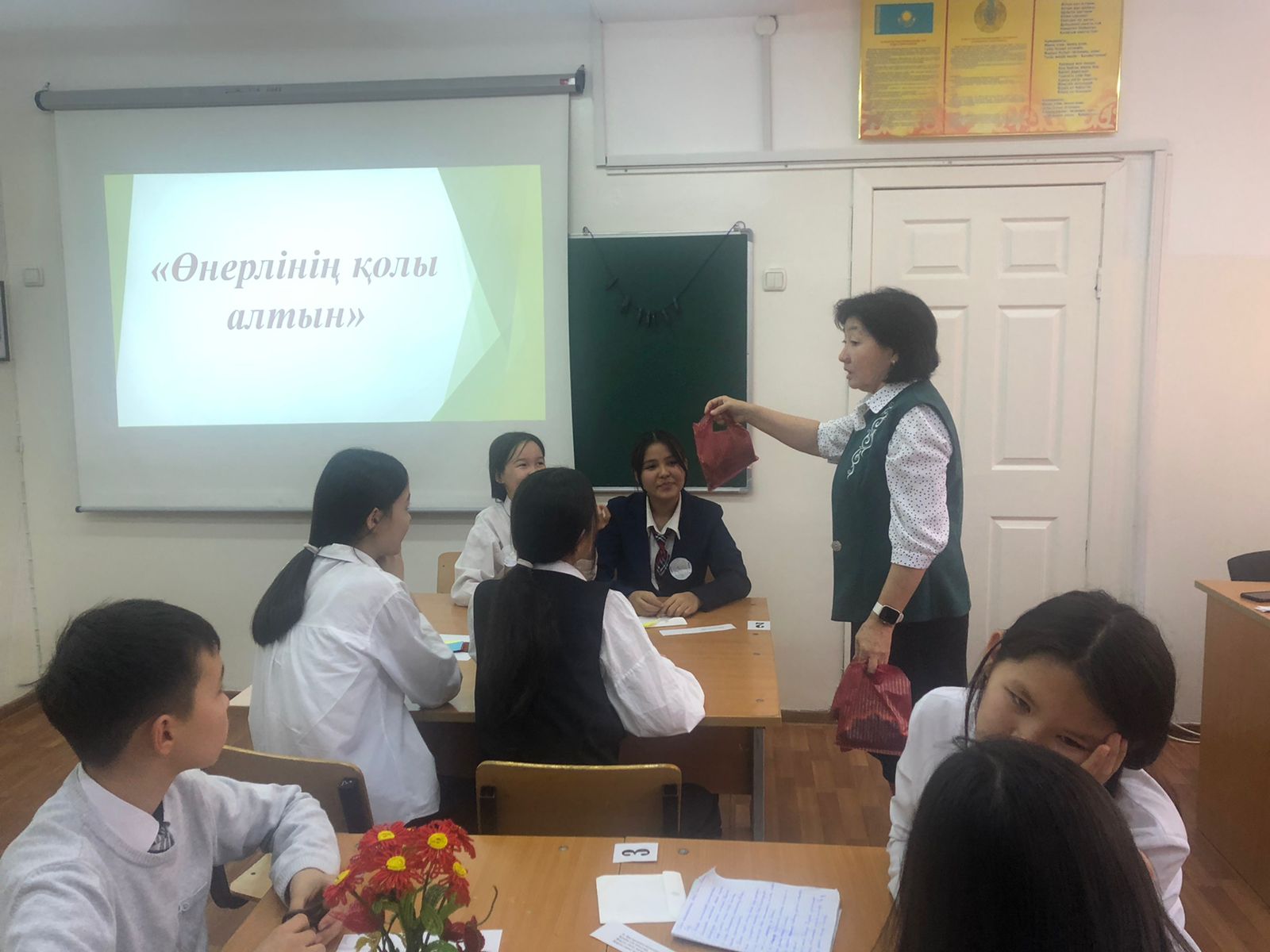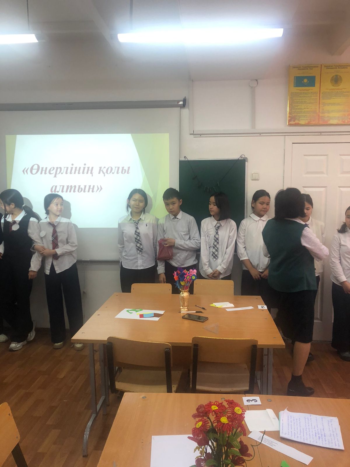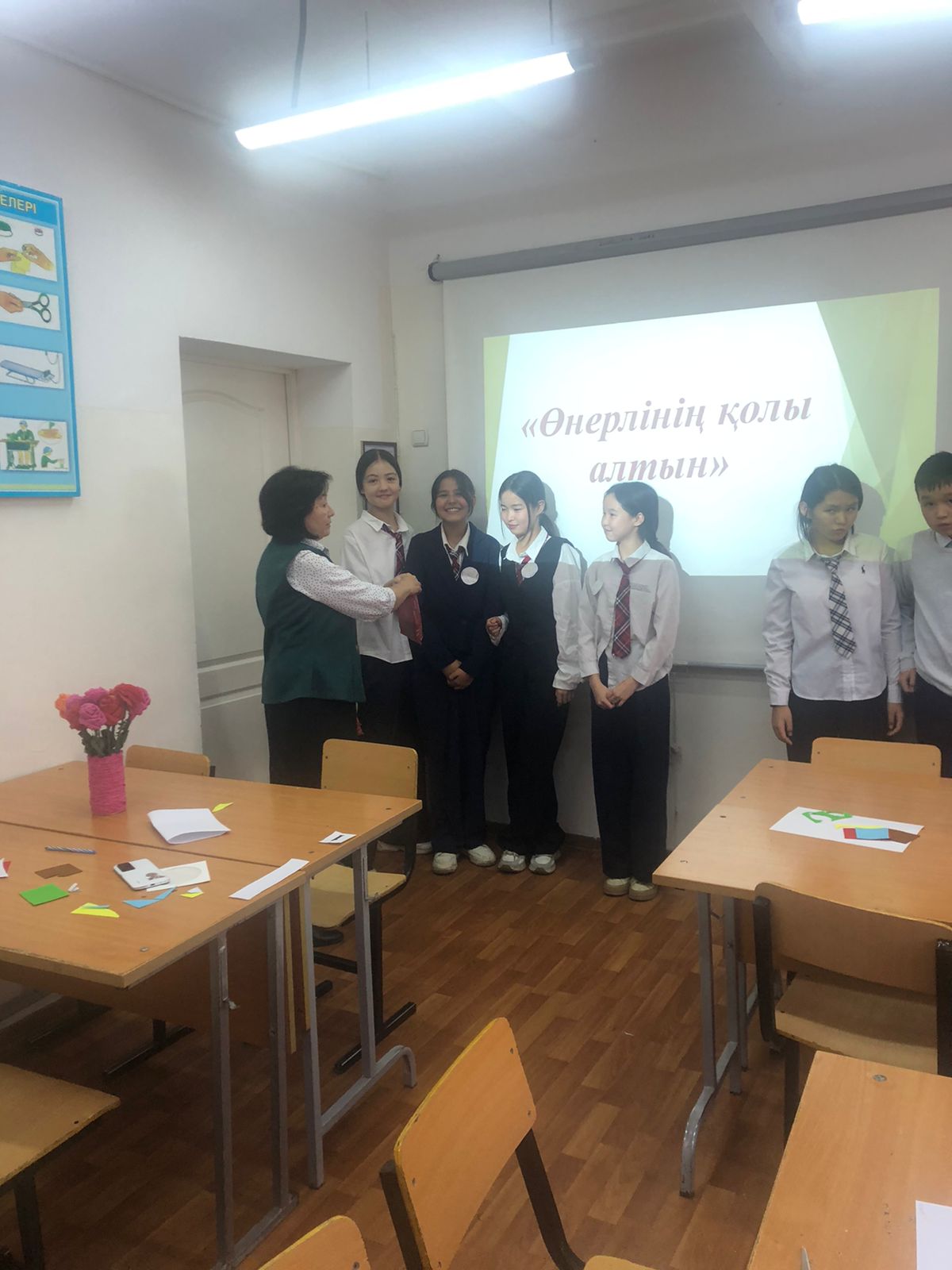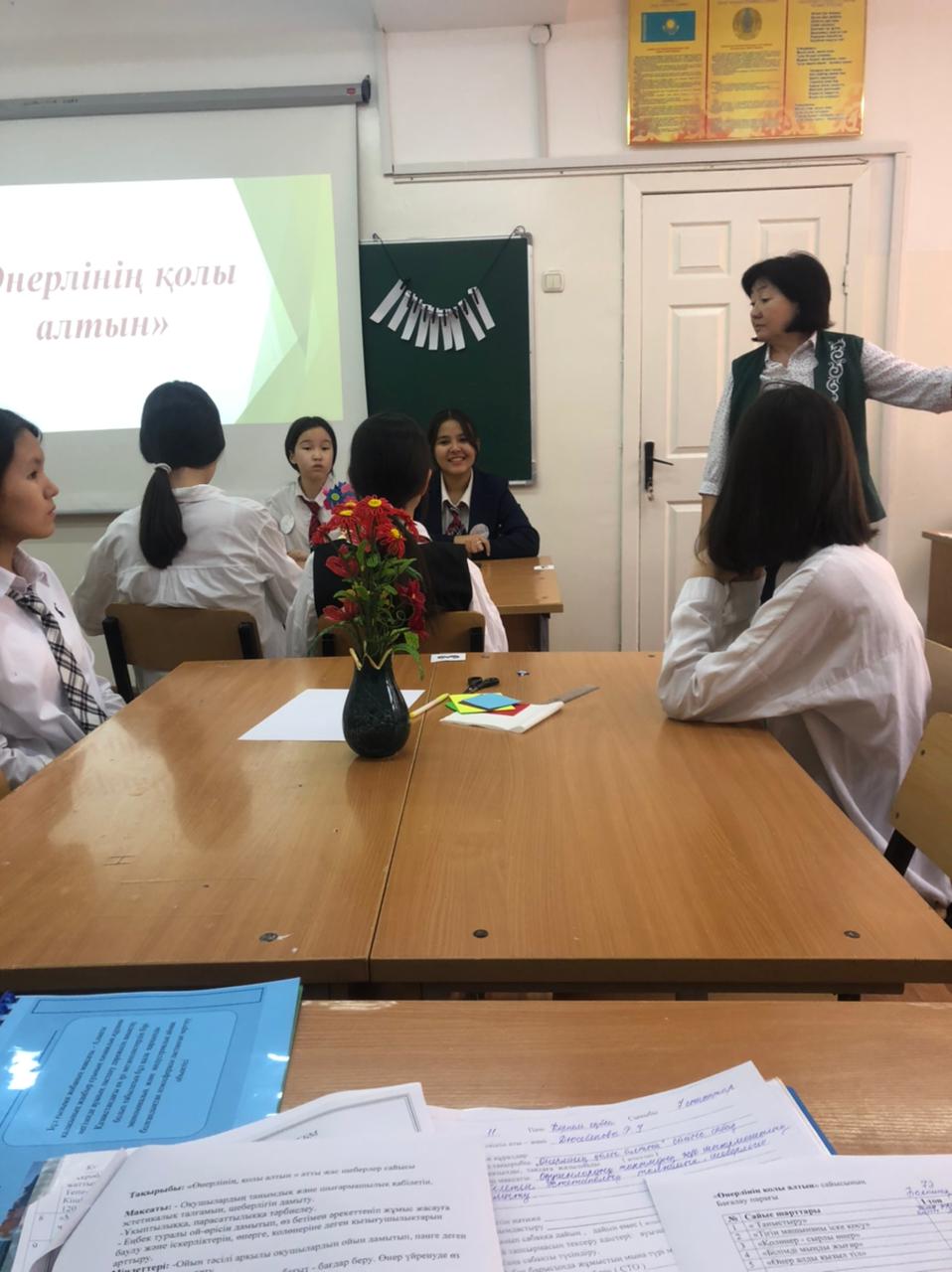 №164 Жалпы білім беретін мектеп » Ақпарат » "Еңбекке жастан, өнерге бастан" атты Өнер әдістемелік бірлестігі пәні мұғалімдері онкүндігінде көркем еңбек пәні мұғалімі Р.Дюсебекова 7 сынып оқушыларымен "Өнерлінің қолы алтын" тақырыбында сайыс сабақ өткізді.