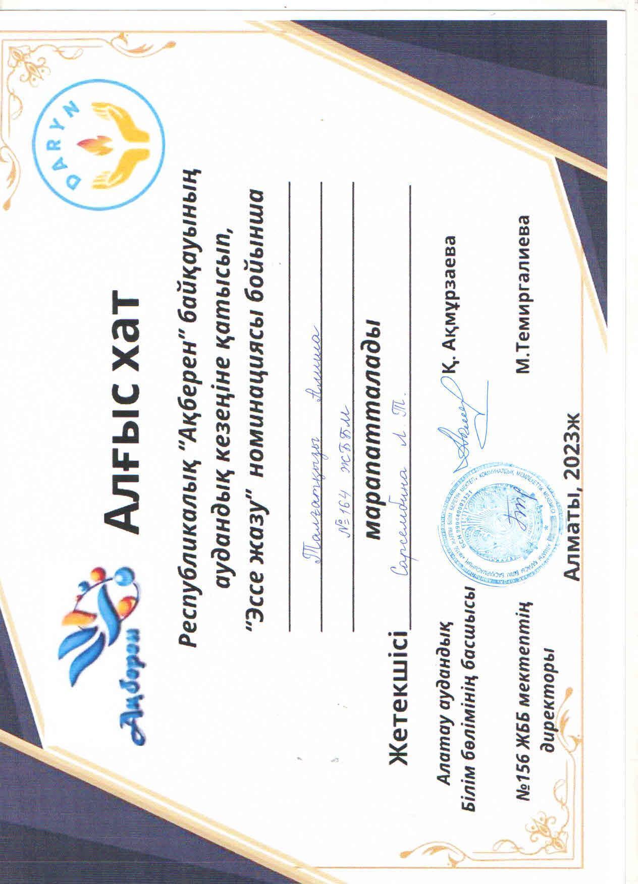 №164 Жалпы білім беретін мектеп » Ақпарат » "Ақберен" Республикалық өнер байқауының АУДАНДЫҚ кезеңінде "Эссе жазу" номинациясы бойынша 8 "Г" сынып оқушысы А.Талғатқызы қатысып, Алғыс хатқа ие болды. Жетекшісі қазақ тілі мен әдебиеті пәні мұғалімі Л.Сарсембина