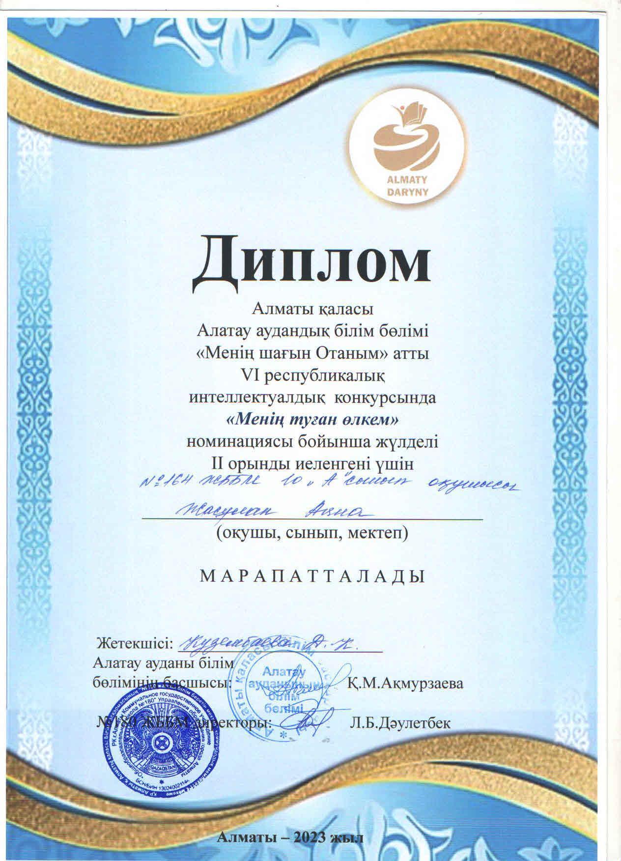 "Менің шағын Отаным" атты VI республикалық интеллектуалдық конкурсында "Менің туған өлкем" номинациясы бойынша 10 "А" сынып оқушысы А.Жасулан қатысып, ІІ орынға ие болды. Жетекшісі тарих пәні мұғалімі Д.Кузембаева.