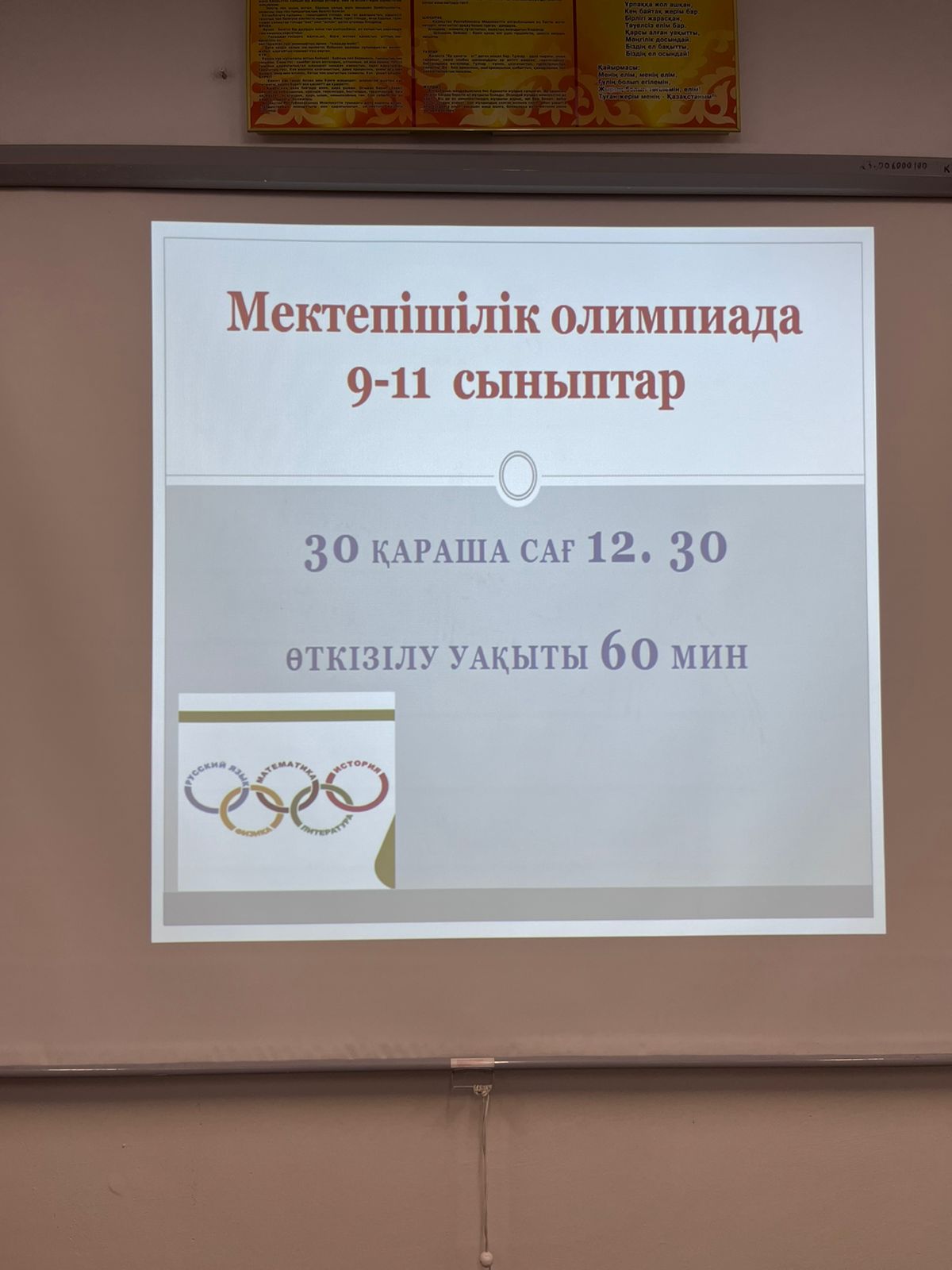 Жалпы білім беретін 9-11 сынып оқушыларына арналған республикалық олимпиаданың МЕКТЕПІШІЛІК кезеңі 30 қараша күні өткізіліп, ең жоғары ұпай жинаған әр сыныптан және әр пәннен 1 оқушы аудандық кезеңге жіберілді.