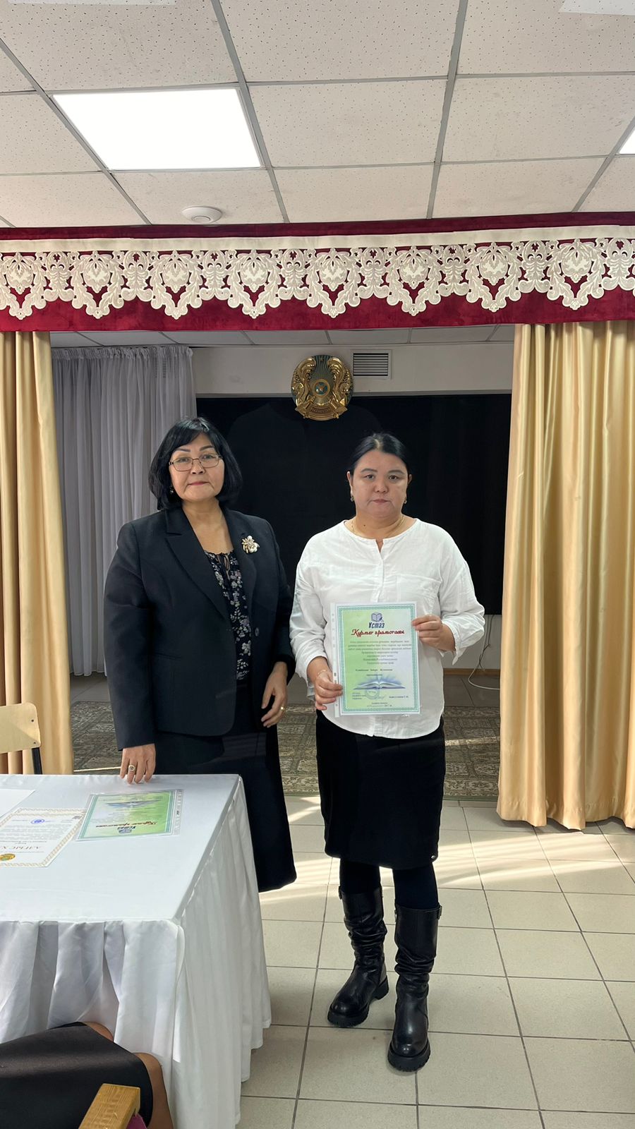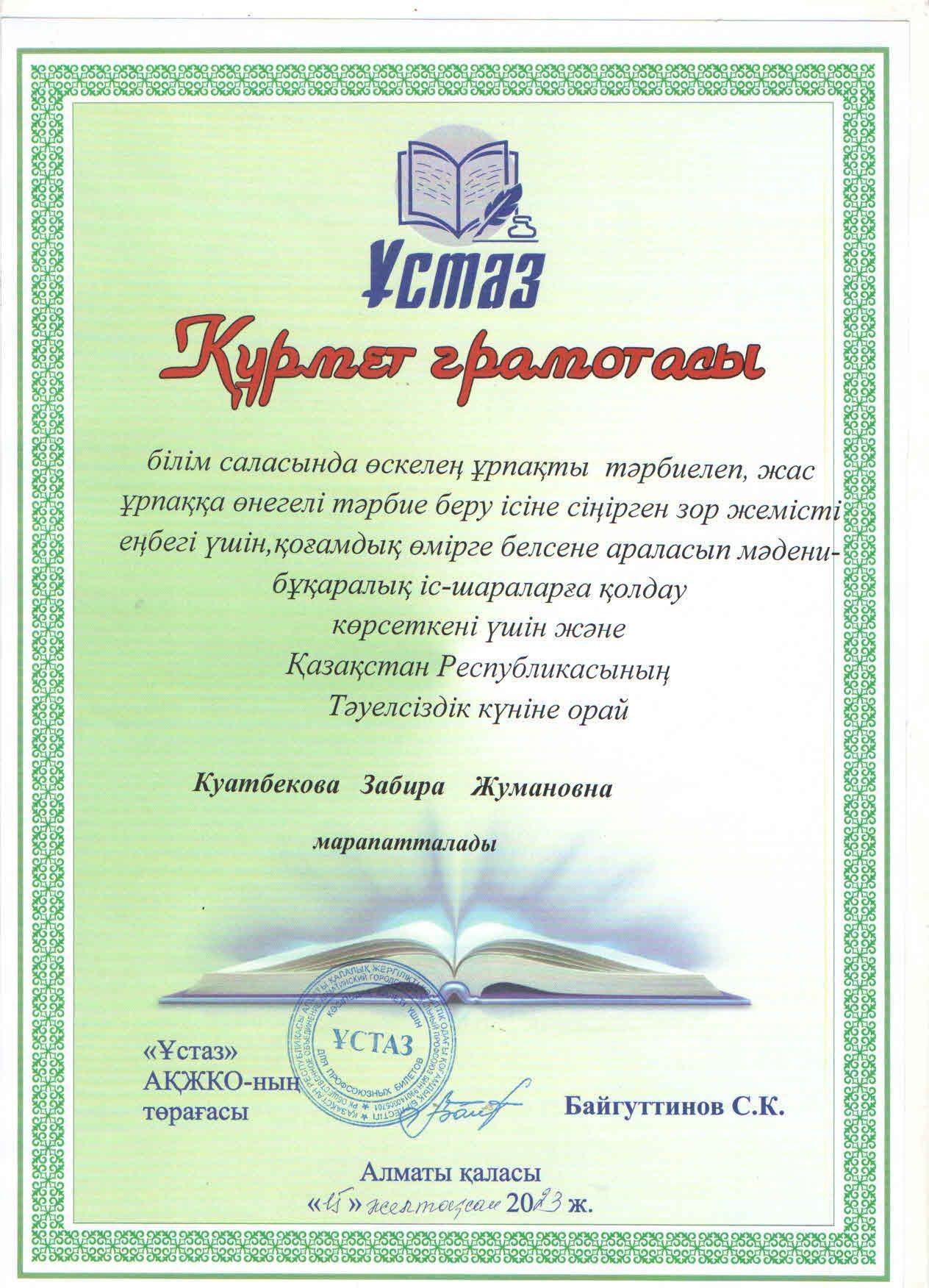 21 желтоқсан 2023 0 1 2 3 4 5 Тәуелсіздік күні мерекесі қарсаңында "Ұстаз" қалалық кәсіподағының Құрмет грамотасымен бастауыш сынып мұғалімі З.Куатбекова марапатталды. Осы беттің QR-коды:QR-код этой страницы: