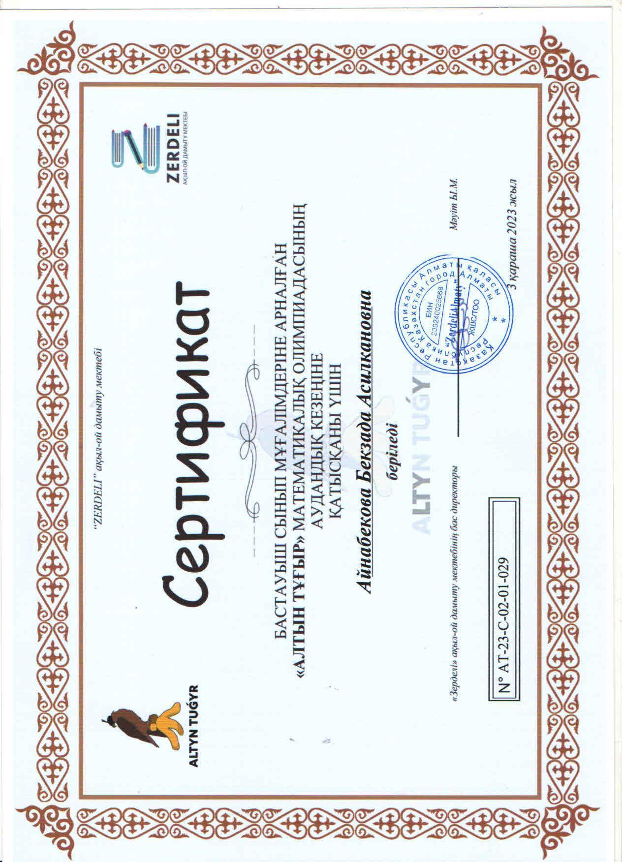 "Зерделі" ақыл-ой дамыту орталығы ұйымдастырған "АЛТЫН ТҰҒЫР" математикалық олимпиадасына қатысқан бастауыш сынып мұғалімі Б.Айнабекова сертификатқа ие болды.