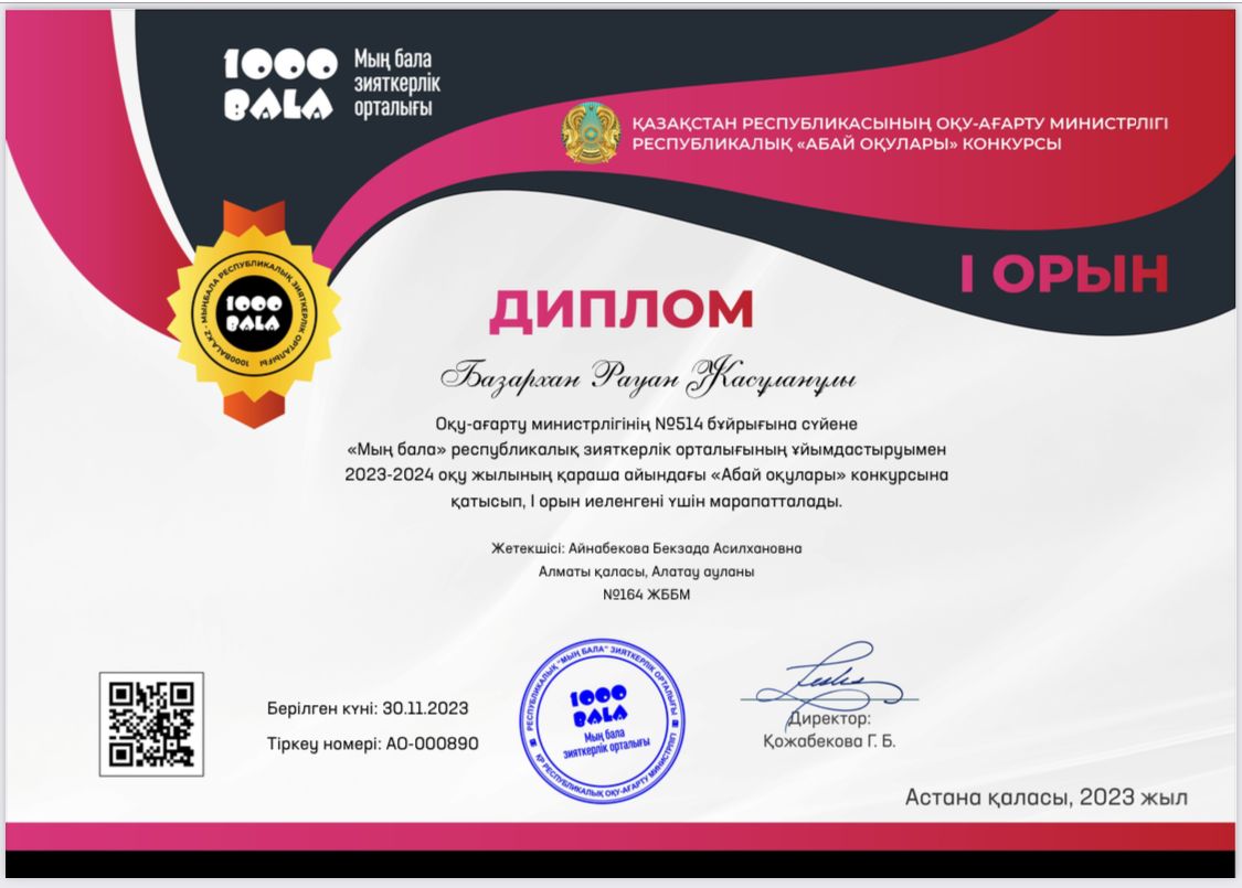 "Мың бала" республикалық зияткерлік орталығының ұйымдастырған "Абай оқулары" байқауының І орын иегерлері 3 "Ә" сынып оқушылары А.Адилбекова, Р.Базархан. Жетекшісі бастауыш сынып мұғалімі Б.Айнабекова.