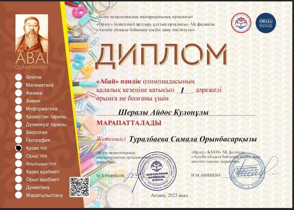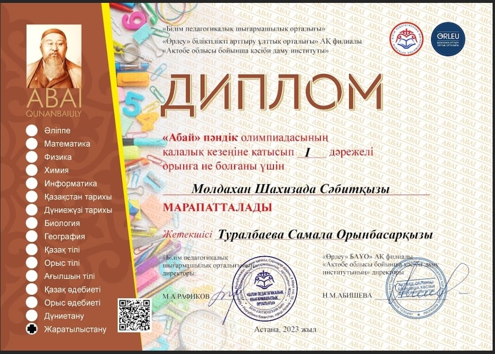 "Білім педагогикалық шығармашылық орталығы" ұйымдастырған "Абай" пәндік олимпиадасының қалалық кезеңінің І орын иегері 3 "А" сынып оқушысы А.Шералы, Ш.Молдахан Жетекшісі бастауыш сынып мұғалімі С.Туралбаева.
