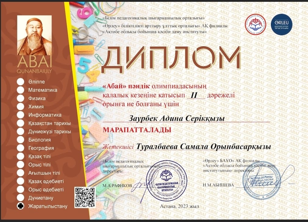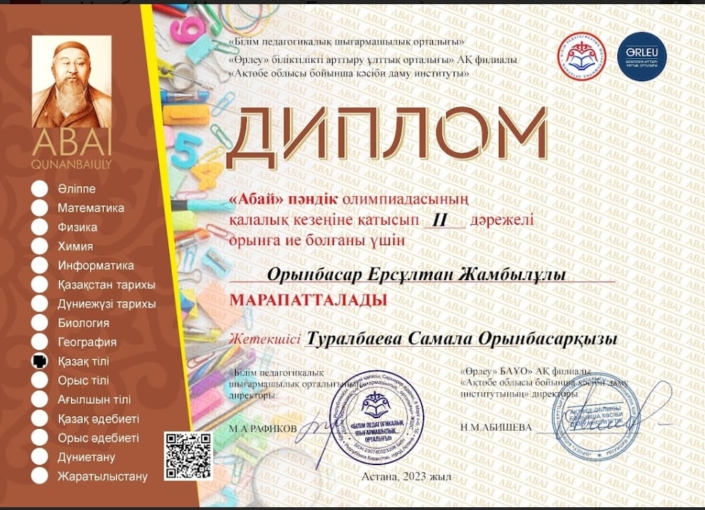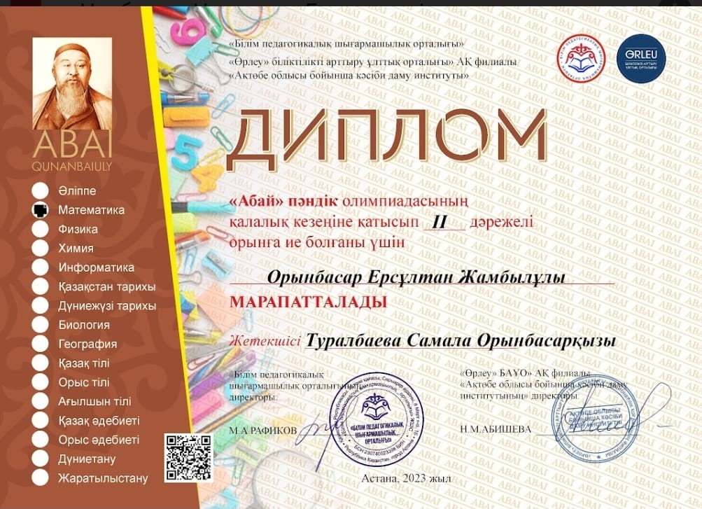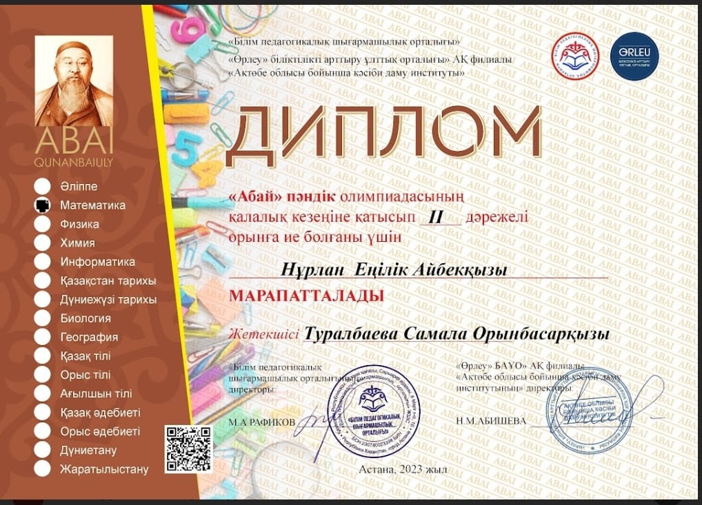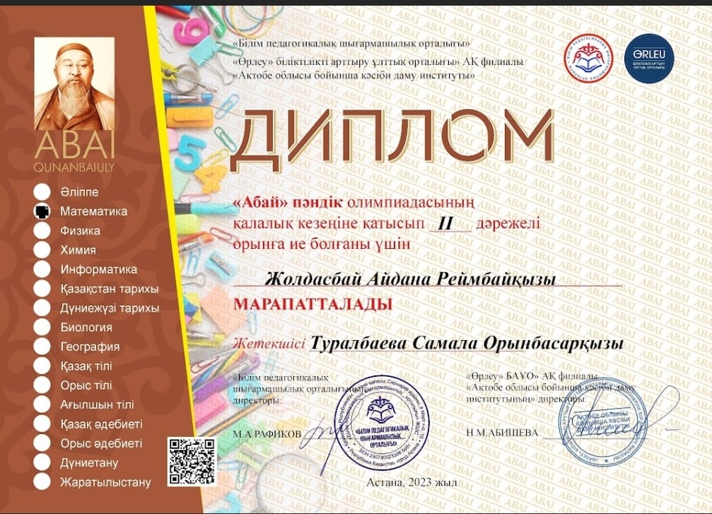 "Білім педагогикалық шығармашылық орталығы" ұйымдастырған "Абай" пәндік олимпиадасының қалалық кезеңінің ІІ орын иегері 3 "А" сынып оқушысы А.Шыналы, Е.Орынбасар, А.Заурбек, А.Жолдасбай, Е.Нұрлан