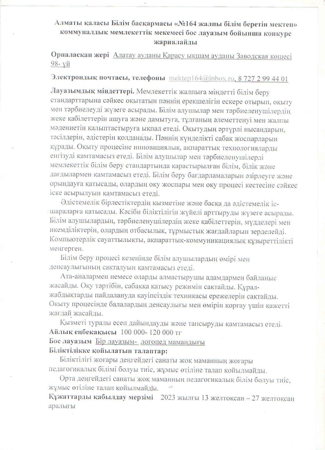 13 желтоқсан 2023 0 1 2 3 4 5 13 желтоқсан мен 27 желтоқсан аралығында логопедтің бос лауазымына конкурс жарияланады Осы беттің QR-коды:QR-код этой страницы: