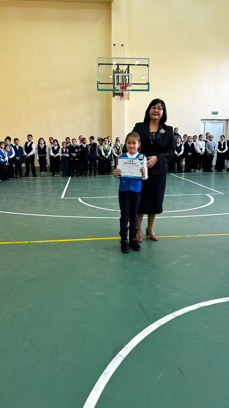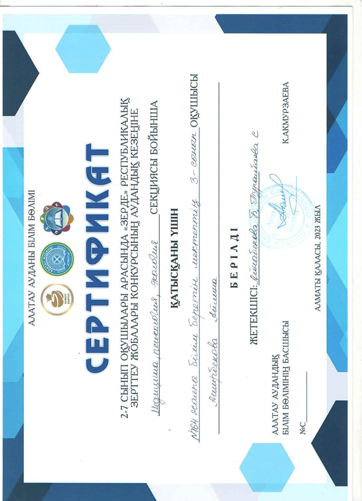 "ЗЕРДЕ" республикалық конкурсының аудандық кезеңінің "Медицина, психология, экология" секциясы бойынша сертификат иегерлері 3 "Ә" сынып оқушылары А.Аширбекова, А.Отарғали.