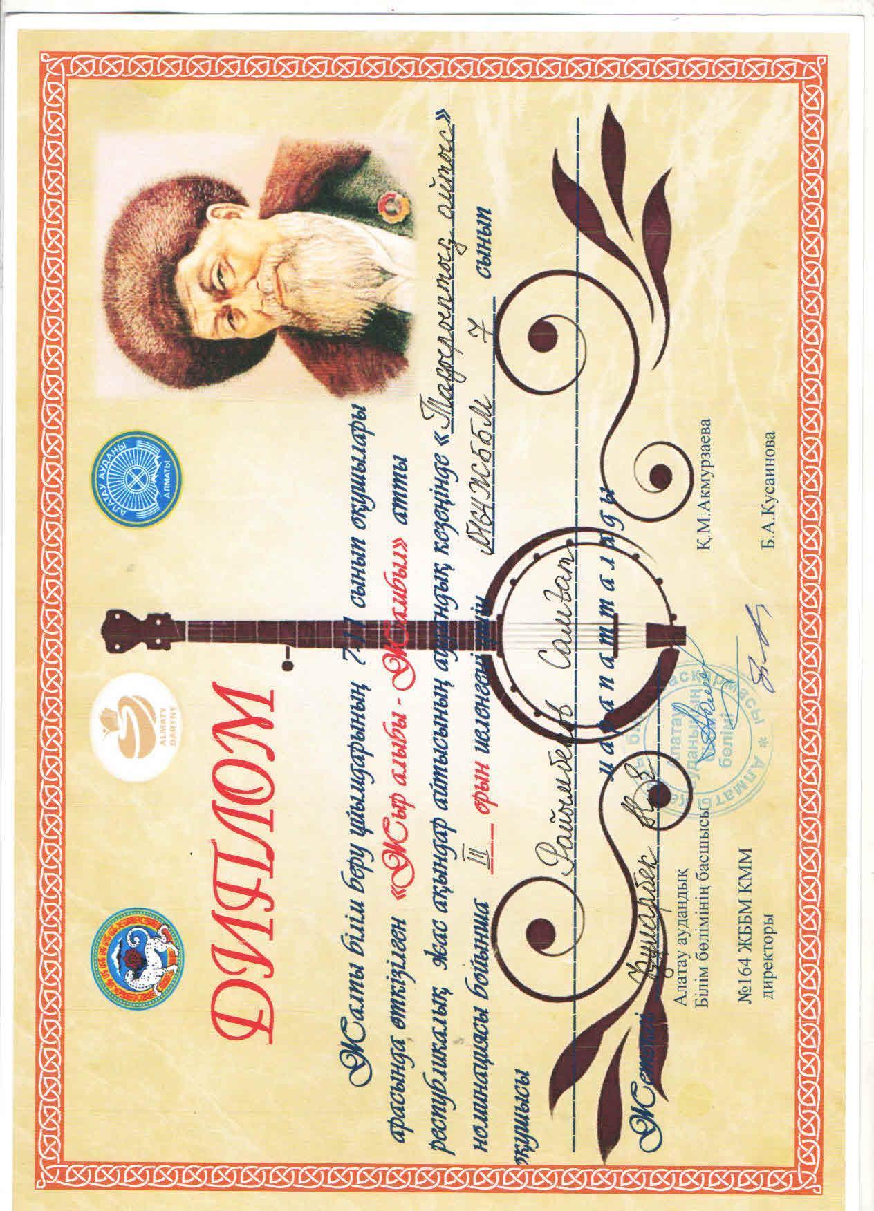 №164 Жалпы білім беретін мектеп » Ақпарат » «Жыр алыбы- Жамбыл» атты республикалық жас ақындар айтысының аудандық кезеңіне "Тақырыптық айтыс" номинациясы бойынша 7 "А" сынып оқушысы С.Райымбеков қатысып, жүлделі ІІІ орынға ие болды.