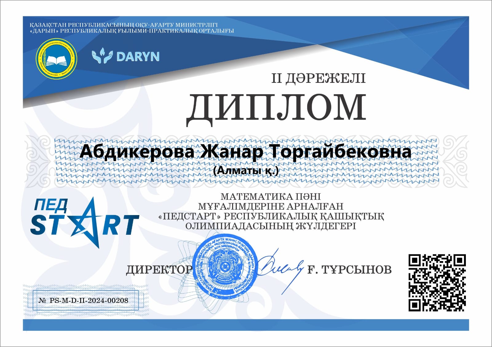 Математика пәні мұғалімдеріне арналған "Педстарт" РЕСПУБЛИКАЛЫҚ қашықтық олимпиадасының ІІ дәрежелі диплом иегері математика пәні мұғалімі мұғалімі Ж.Абдикерова