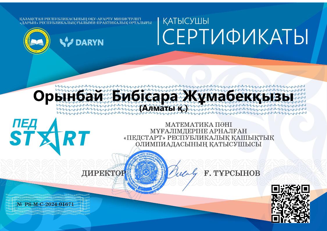 №164 Жалпы білім беретін мектеп » Ақпарат » Математика пәні мұғалімдеріне арналған "Педстарт" РЕСПУБЛИКАЛЫҚ қашықтық олимпиадасының сертификат иегері математика пәні мұғалімі мұғалімі Б.Орынбай