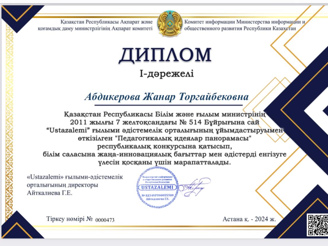 №164 Жалпы білім беретін мектеп » Ақпарат » "Ustazalemi" орталығы ұйымдастырған "Педагогикалық идеялар панорамасы" республикалық конкурсына математика пәні мұғалімі Ж.Абдикерова қатысып, жүлделі І орынға ие болды.