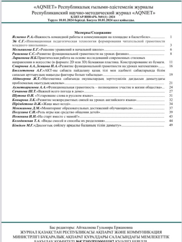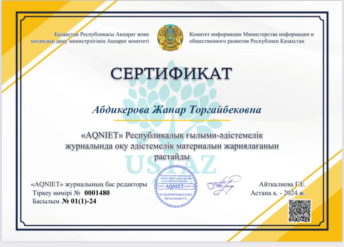 "AQNIET" ғылыми-әдістемелік журналына математика пәні мұғалімі Ж.Абдикерованың "Математика сабағында оқушылардың зерттеушілік дағдысын дамытудағы проблемалық оқытудың ықпалы" тақырыбындағы мақаласы жарық көріп, Алғыс хат алды.