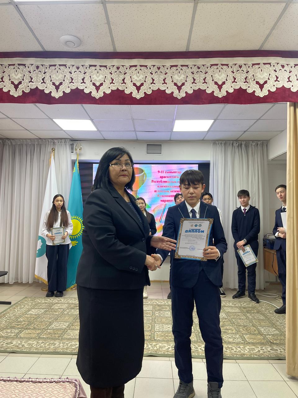 9-11 сынып оқушыларына арналған Республикалық олимпиаданың аудандық кезеңіне ХИМИЯ пәні бойынша 9 "Ә" сынып оқушысы А.Журабеков қатысып, жүлделі І орынға ие болды. Жетекшісі химия пәні мұғалімі М.Кинаятова.